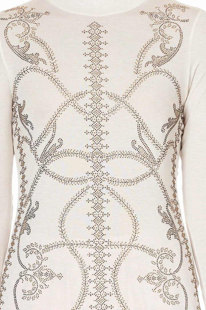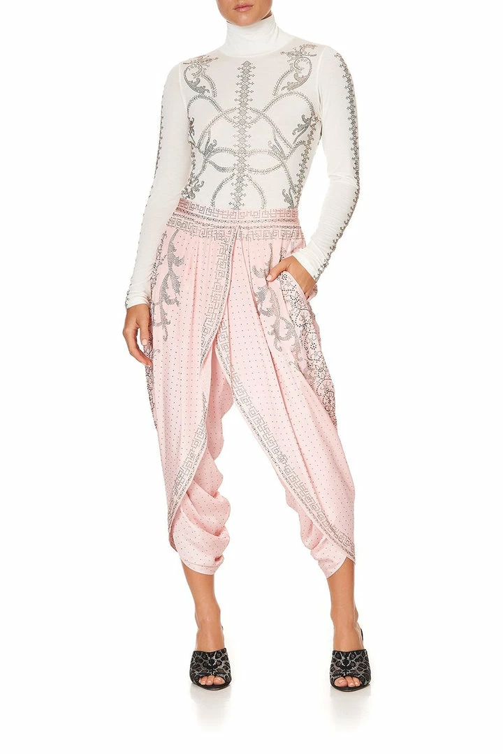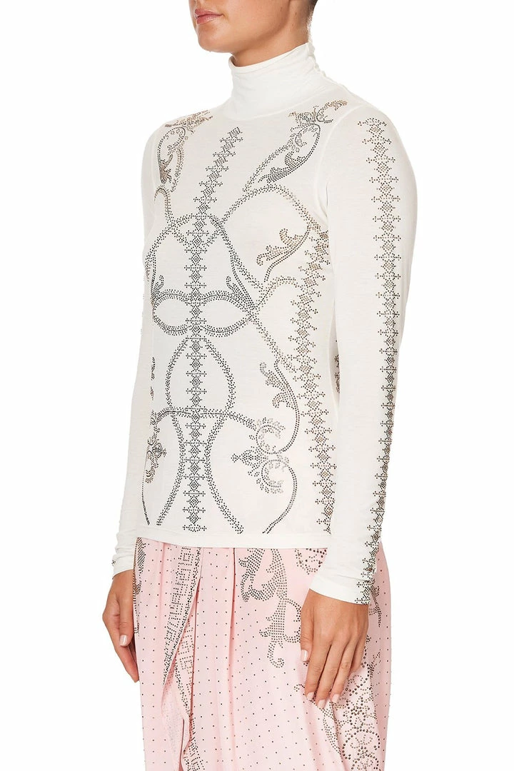 Elevating a classic base layer to something divinely out of this world, the Luxe Cream Jersey Turtleneck is an all-cream tee with high neck, long sleeves and a fitted body. Inspired by a starlit dance at midnight, the body of this super soft cream layering piece is intricately decorated with a dazzling array of hand-placed CAMILLA crystals. This opulent polo-neck adds a layer of warmth and luxury to matching prints in this season’s collection.