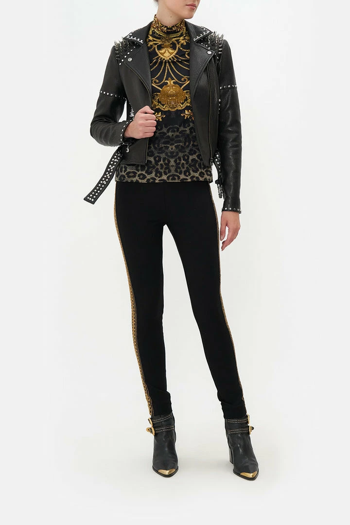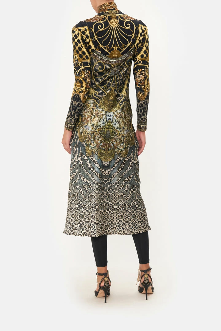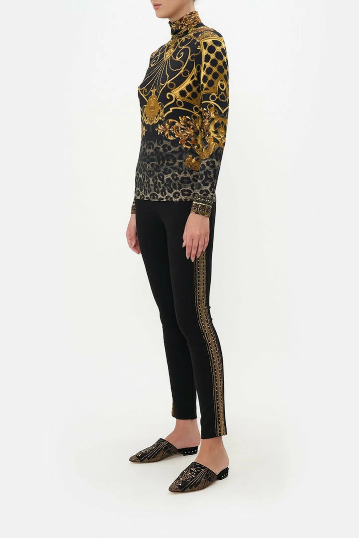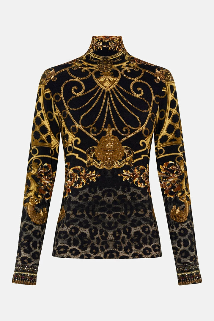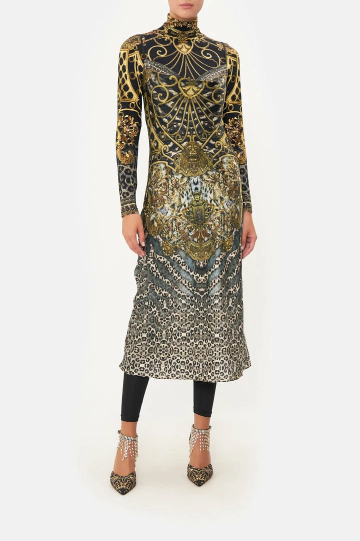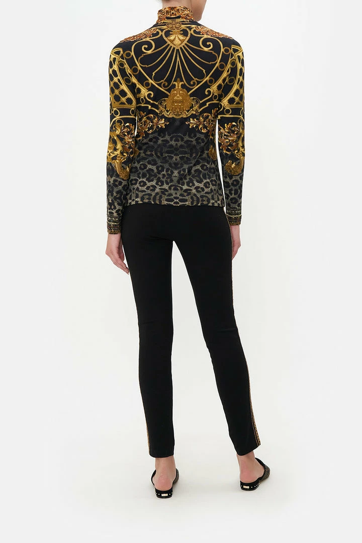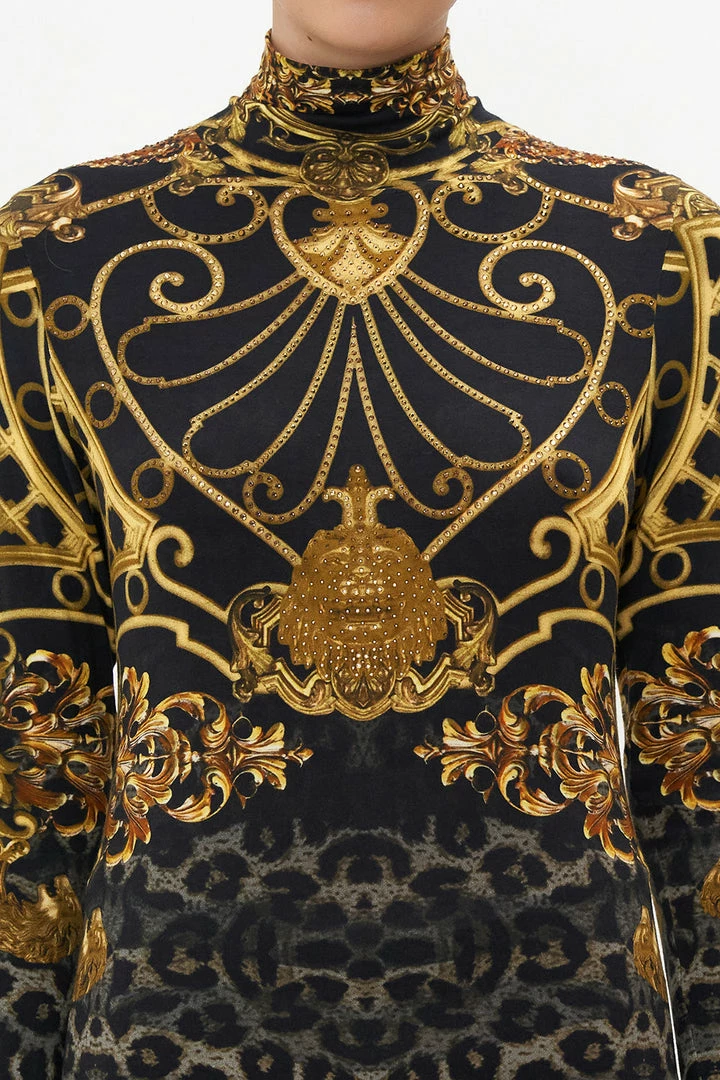 An ode to ornate details fusing with elevated essentials, the Shadows Of Armada Jersey Turtleneck is encapsulated by classic midnight shades that are encased with gold baroque detailing, grey leopard print and striking swirls of opulent architecture. Adorning hand-embellished CAMILLA crystals, this luxury turtleneck features a full sleeve, a fitted bodice that hugs your waist and curves, a high neckline and a silhouette that falls effortlessly to the hip.