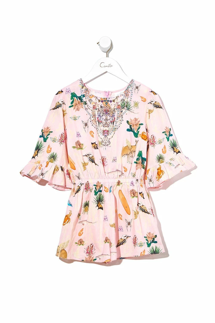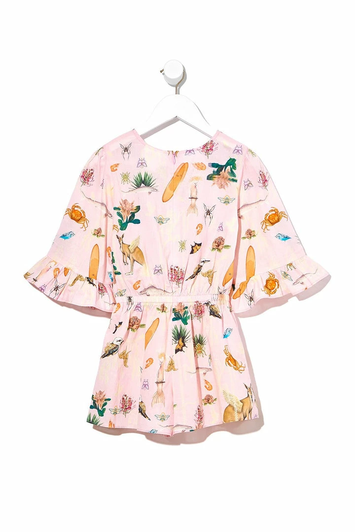 With a brilliant pink canvas hosting a chorus of Australian icons, the Over The Rainbow Kids Playsuit with Frill Sleeve is every bit darling. This charming summer playsuit features breezy raglan sleeves, elasticated waist and neck, as well as hand-placed resin crystals as detail. Perfect for summertime pool parties.