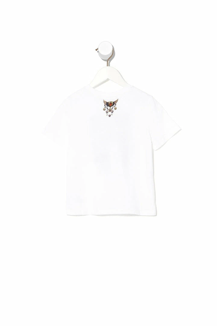 Blending punk rock angst with signature CAMILLA whimsy, the London Calling Kids Short Sleeve T-Shirt 12-14 gives a fun punk inspired update to a classic white tee. Sitting in a frame of safety pin motifs, a signature CAMILLA statement of love has all the hallmarks of a rock and roll makeover. Crafted from pure cotton with short sleeves and round neck, this classic t-shirt silhouette is the perfect base for your superstar’s rock and roll inspired look. Style with ripped jeans, sunglasses and boots for casual weekend styling.