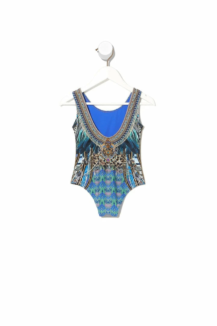 Mini-me lovers of music will rejoice in the vibrancy of the Animal Army Kids Swim One Piece 12-14. Inspired by the anthem of a rock and roll revolution, blue and green jewel tones are accented with pops of animal print and swirling gold highlights. Offering full coverage, this swim one piece is crafted from a sun safe recycled nylon and styled with a scoop neck that is decadently decorated with CAMILLA resin crystals. On the reverse, a deep scoop back finishes the look.
