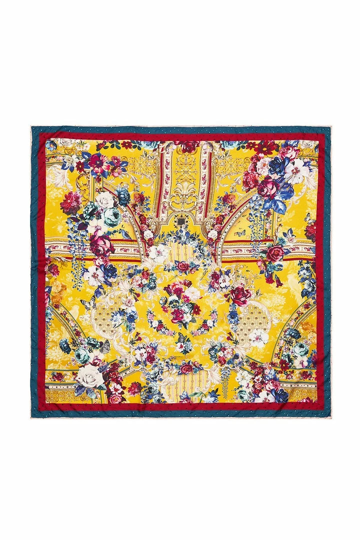 Crafted in a sumptuous silk, the Crowned Roses Large Square Scarf is enveloped in honeyed golds and abundant florals, inspired by the romance of Victorian history. This luxe scarf is embellished with hand-placed crystals and framed with a bold contrast border. Drape around the neck for a dash of colour to your outfit, or easily elevate a classic ponytail with a finishing touch of silk.