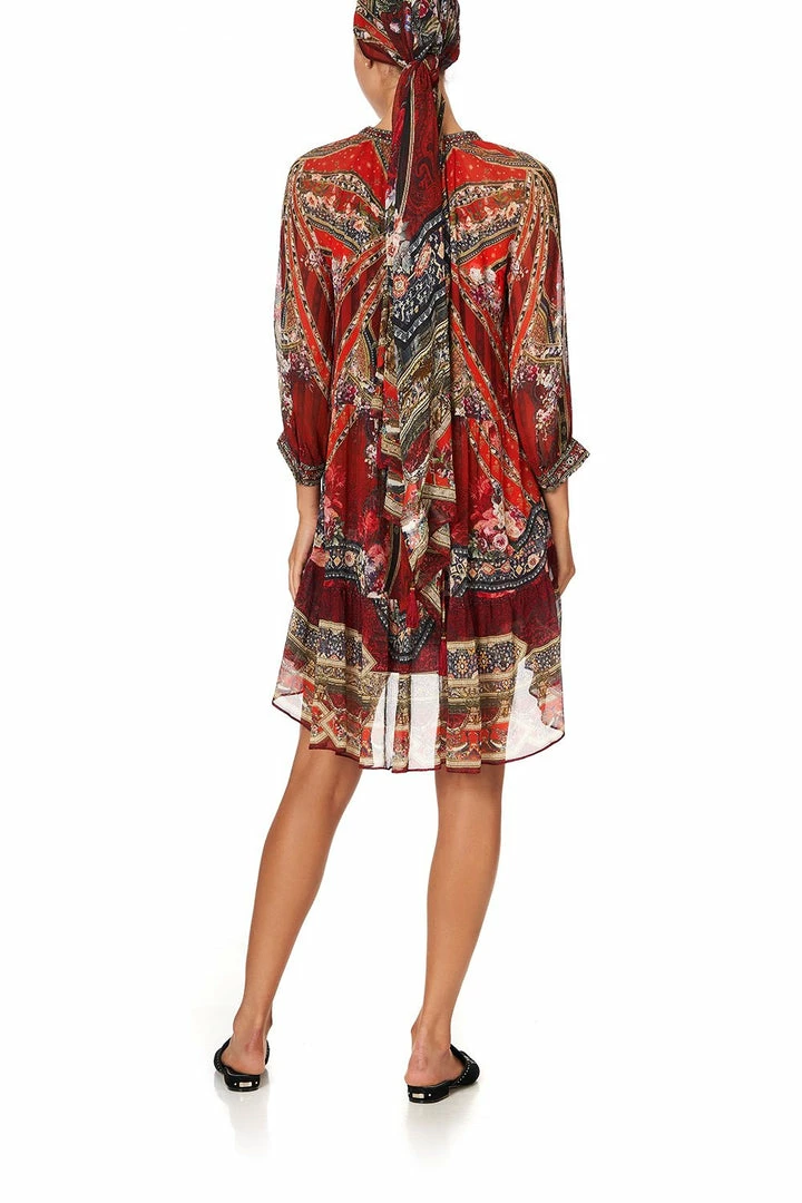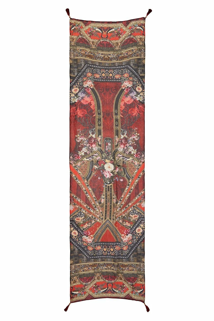 A medley of Byronic imagery set against a setting of evocative red; The Stories of a Station Long Scarf is an epic love poem to the romance of Victorian England. This dramatically daring statement scarf is decorated with a chorus of luminous CAMILLA crystals and trimmed with luxe beaded tassels. Style as a headband and allow to tumble down among your curls for an unconcerned bohemian aesthetic.