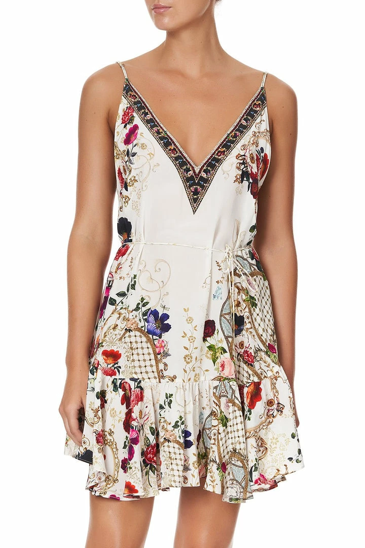 An ethereal reimagination of silk slip dress, Fairy Godmother Mini Dress with Ruffle Hem is enriched with tales of magical romance. Crafted in a floaty CAMILLA printed silk inspired by a bouquet of hand-painted florals blooming against a fanciful cream back drop, this short summer dress features an adjustable strap, side pockets and a gathered hem. Pair back with statement heels to revel in romance.