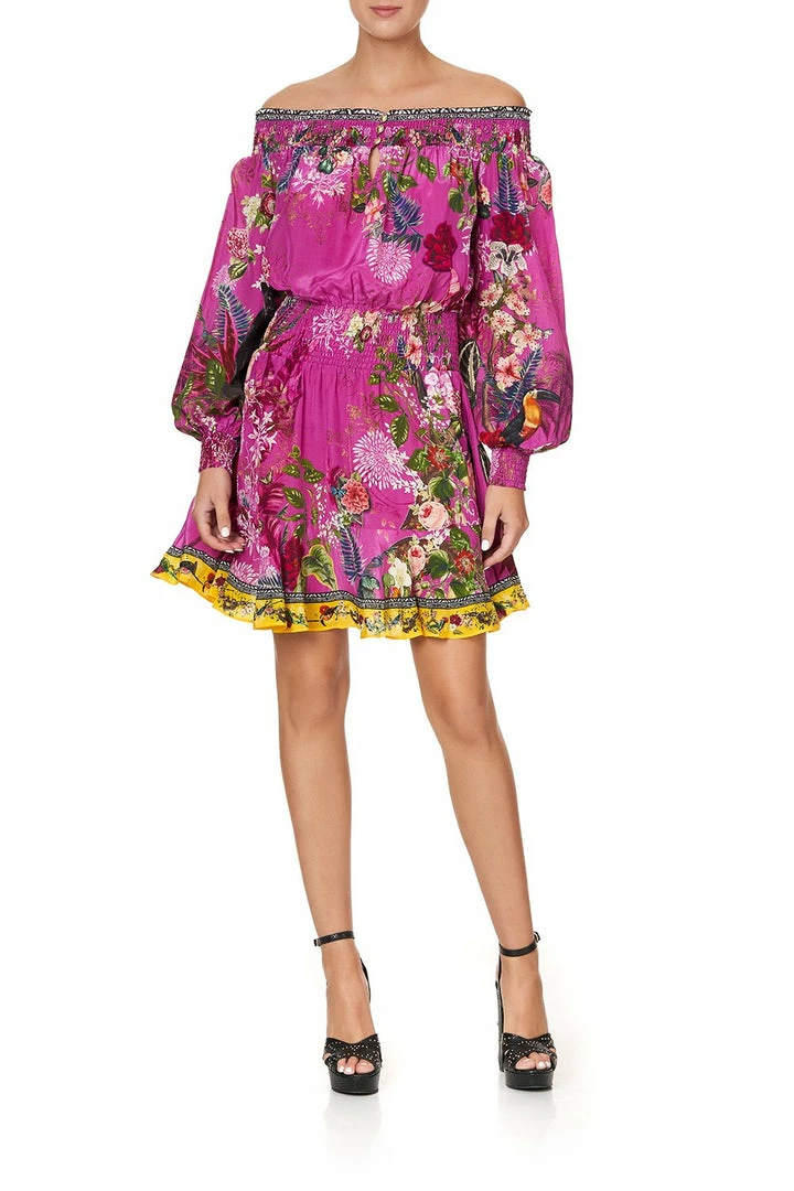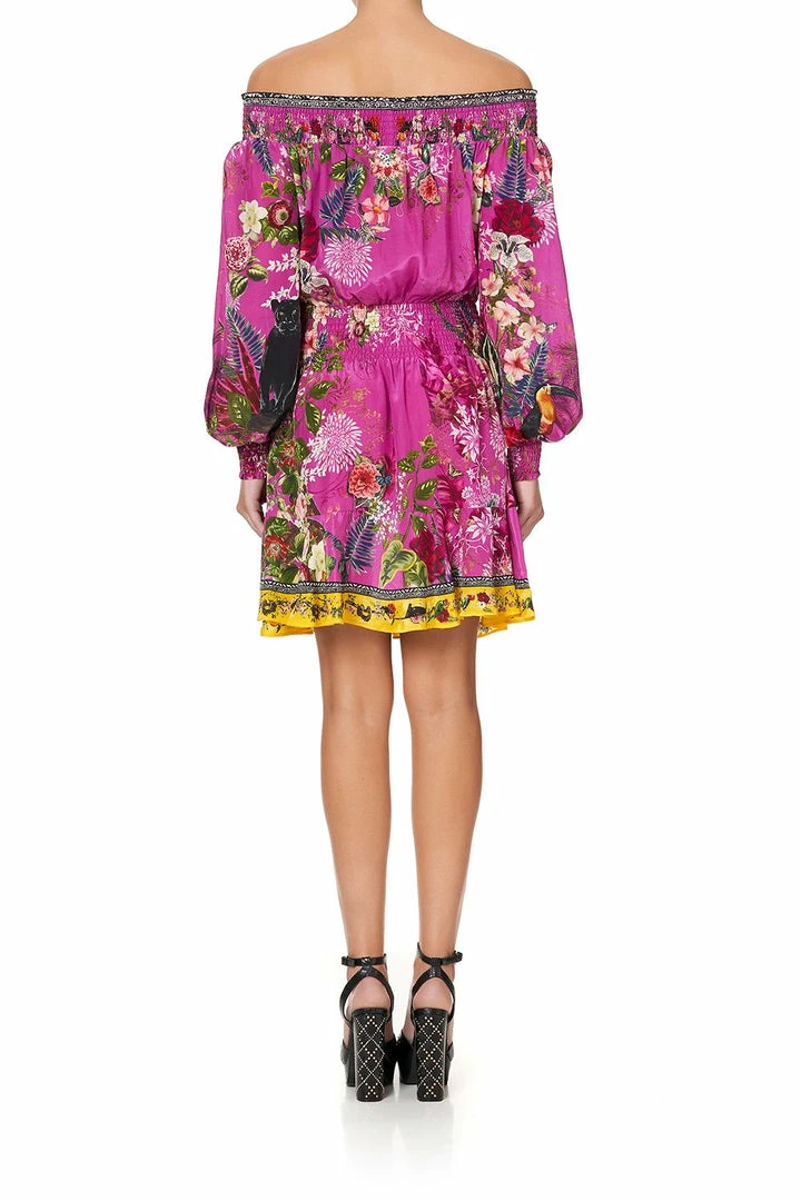 A charming dreamtime mini dress, the Jungle Language Off Shoulder Short Dress exuding femininity and chic edgy comfort through bright hues and popping pink and yellow tones, bringing to life the a magical garden surrounded by manicured walls and overgrown blooms. An elasticated shirred waist, neckline and cuff allow the garment to sit high or low on the waist & arm for a preferred length and fit. Featuring a frilled hemline, carefully placed crystal embellishments and three button centre closure which feature bespoke CAMILLA details.