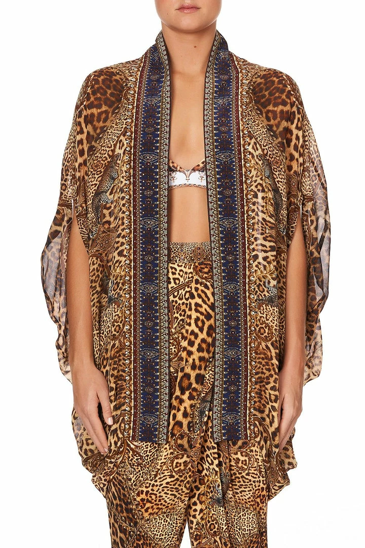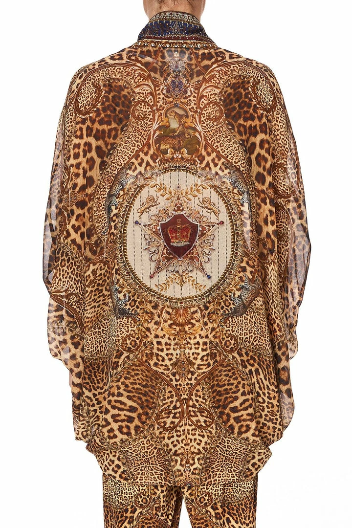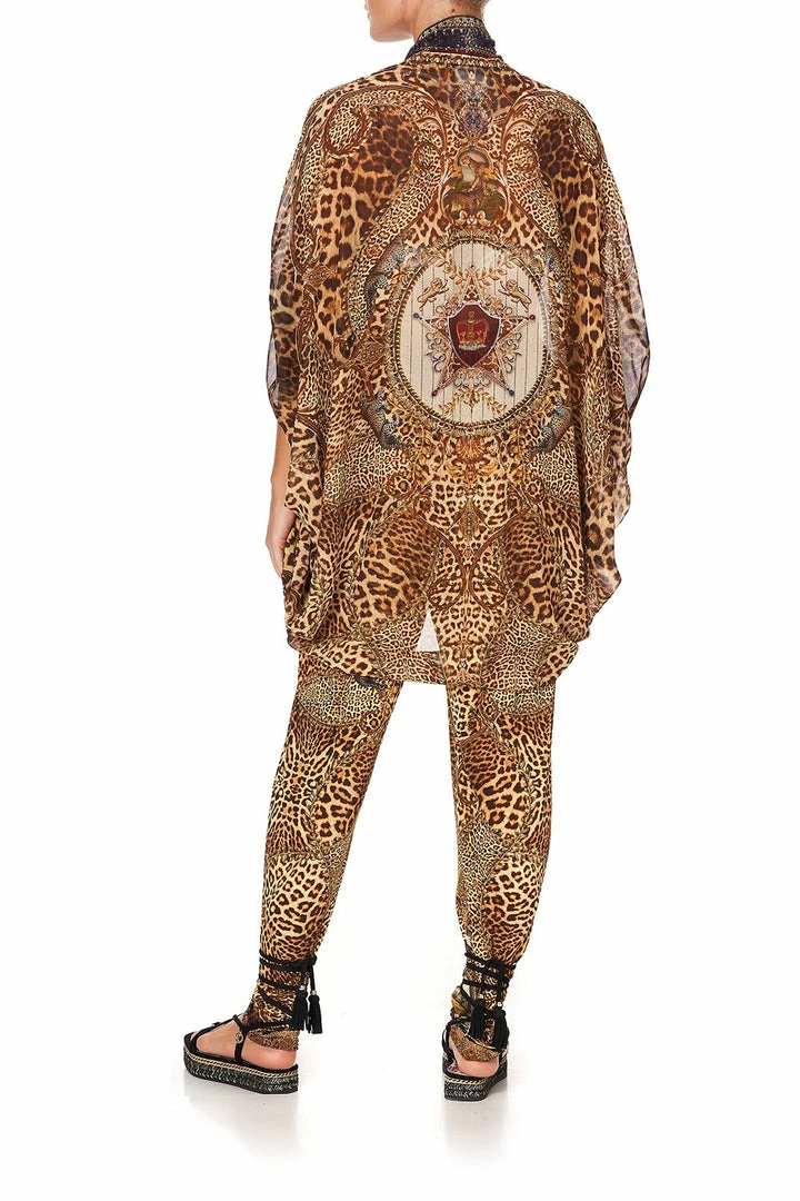 Delightfully rebellious, the Lady Lodge Open Front Cardi Cape is inspired by an outspoken mistress of the manor spellbound with an insatiable appetite for adventure. Embodying her capricious nature, playful leopard print is interspersed with smart pinstripes and regal motifs. A contrast neckband decorated with hand-placed CAMILLA crystals adds structure to this draped jacket style. Crafted from pure CAMILLA silk, a gentle curve at the hem and billowing sleeves gives a relaxed bohemian look, making it the perfect summer layering piece. Wear back with the Lady Lodge Drop Shoulder Playsuit for a tonal aesthetic.