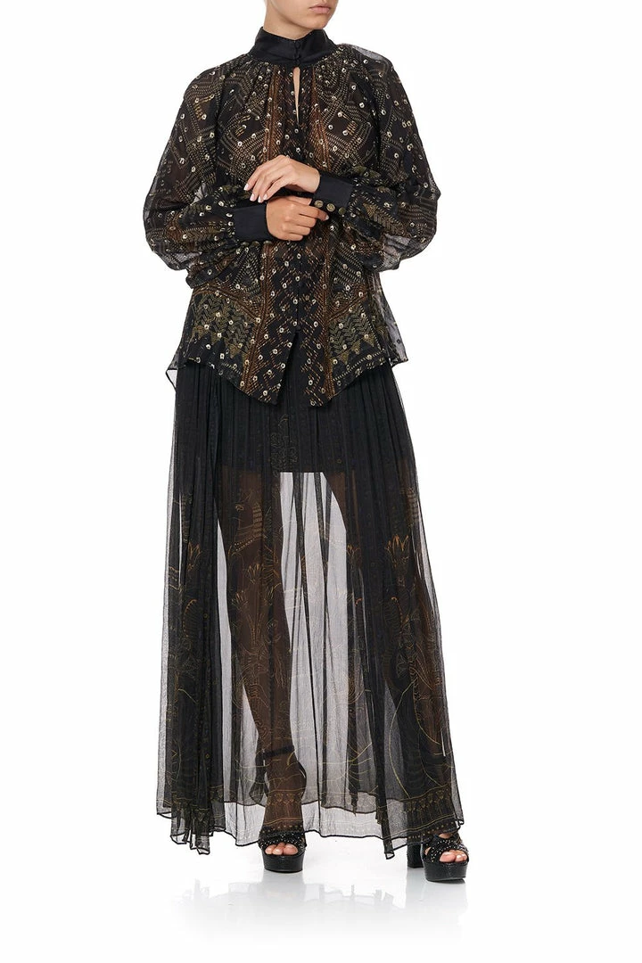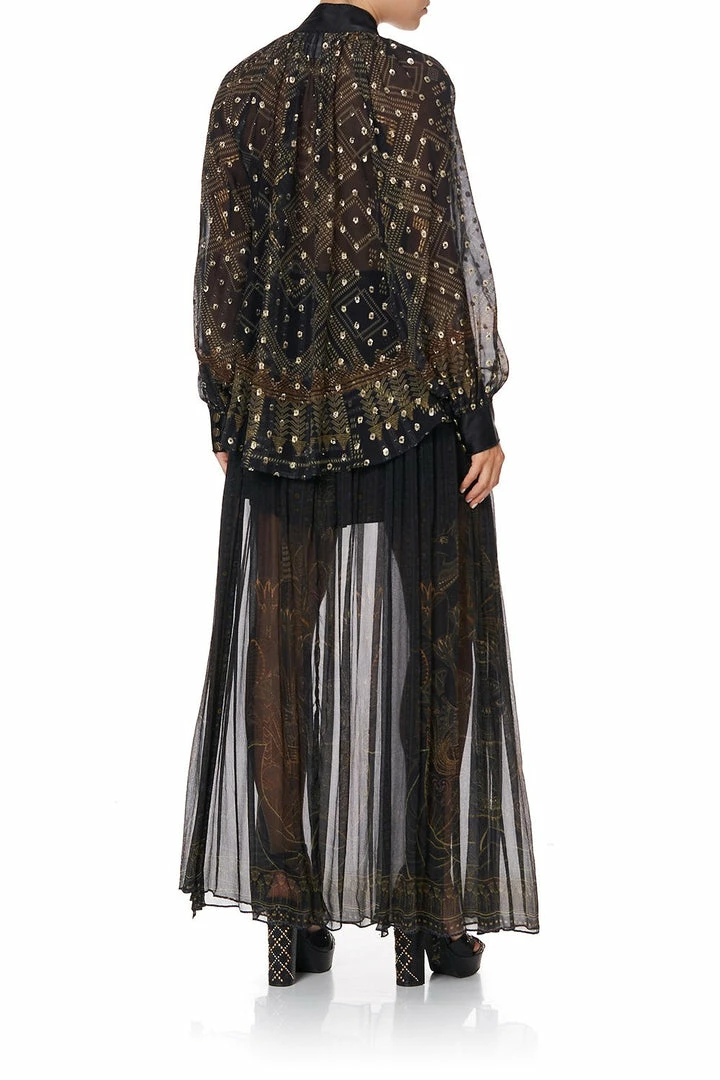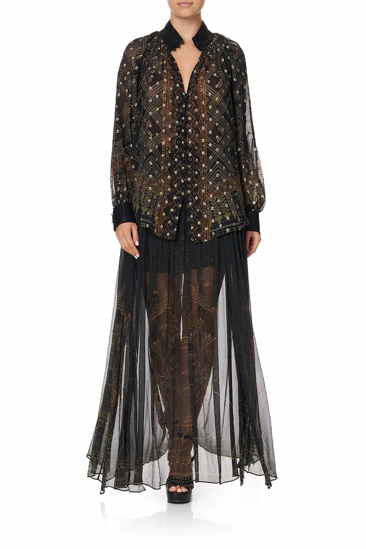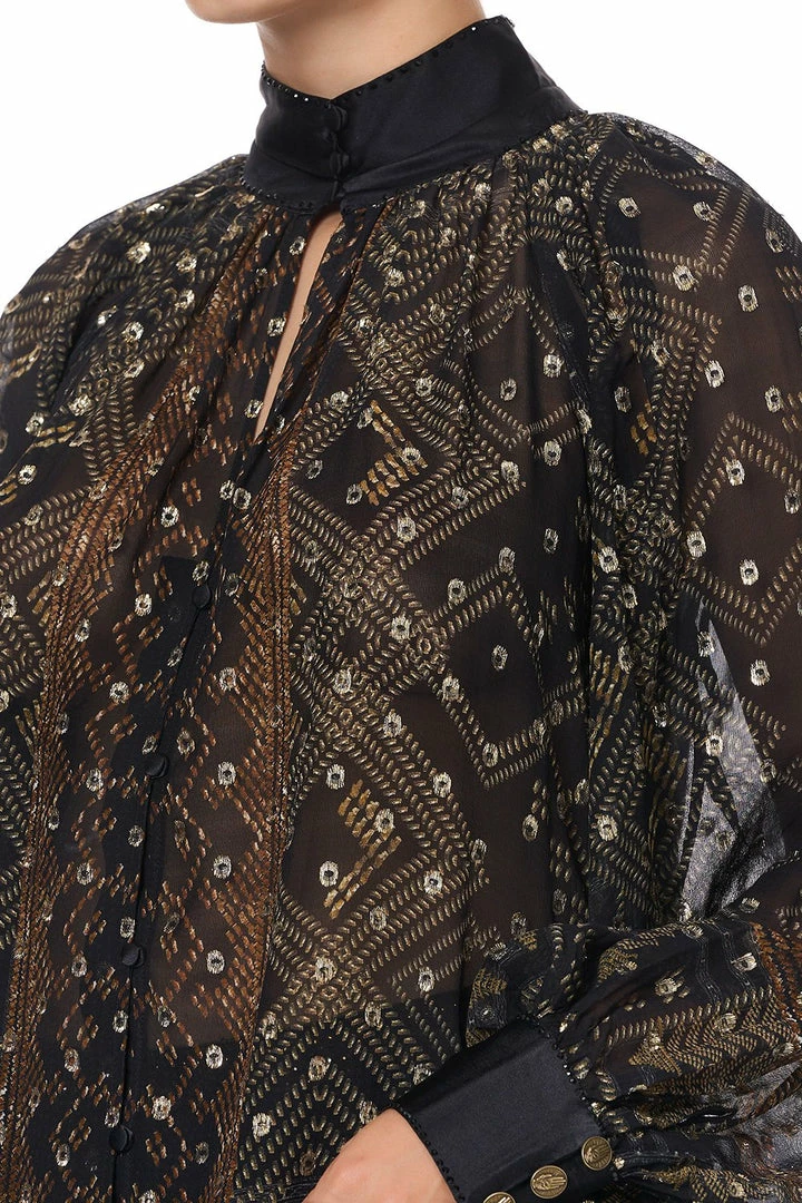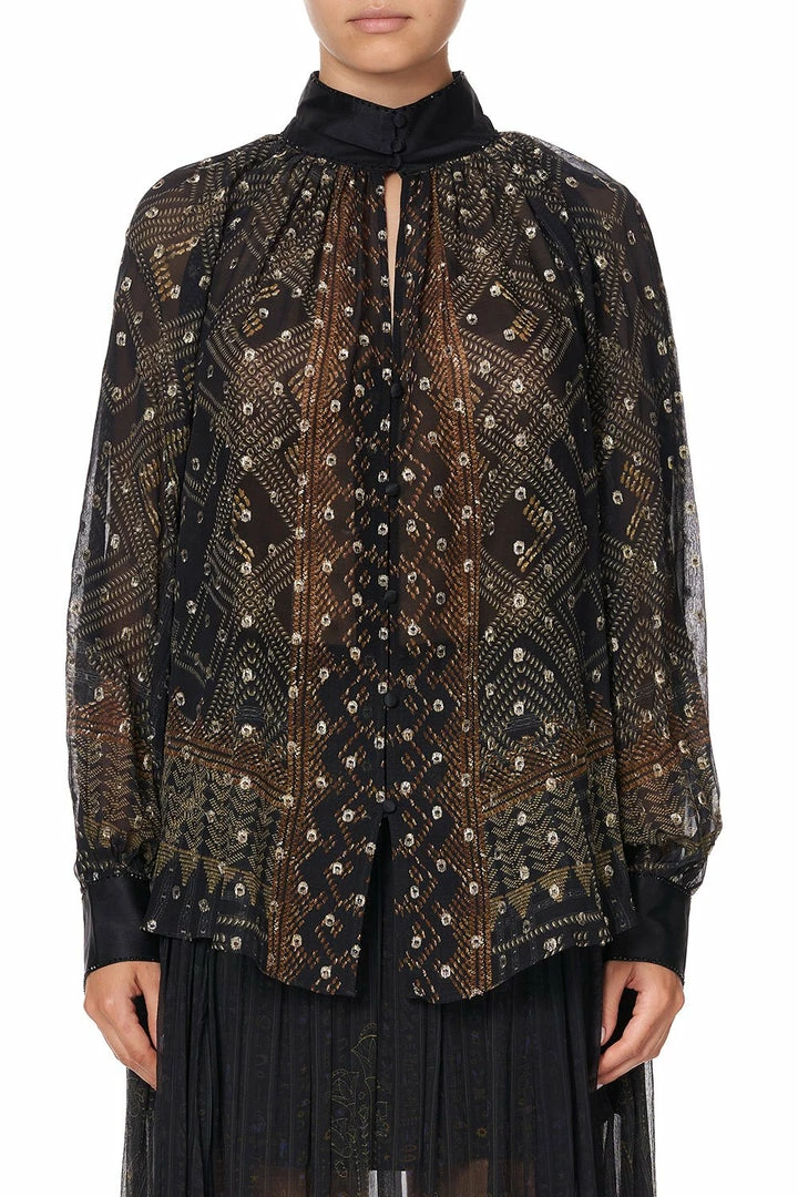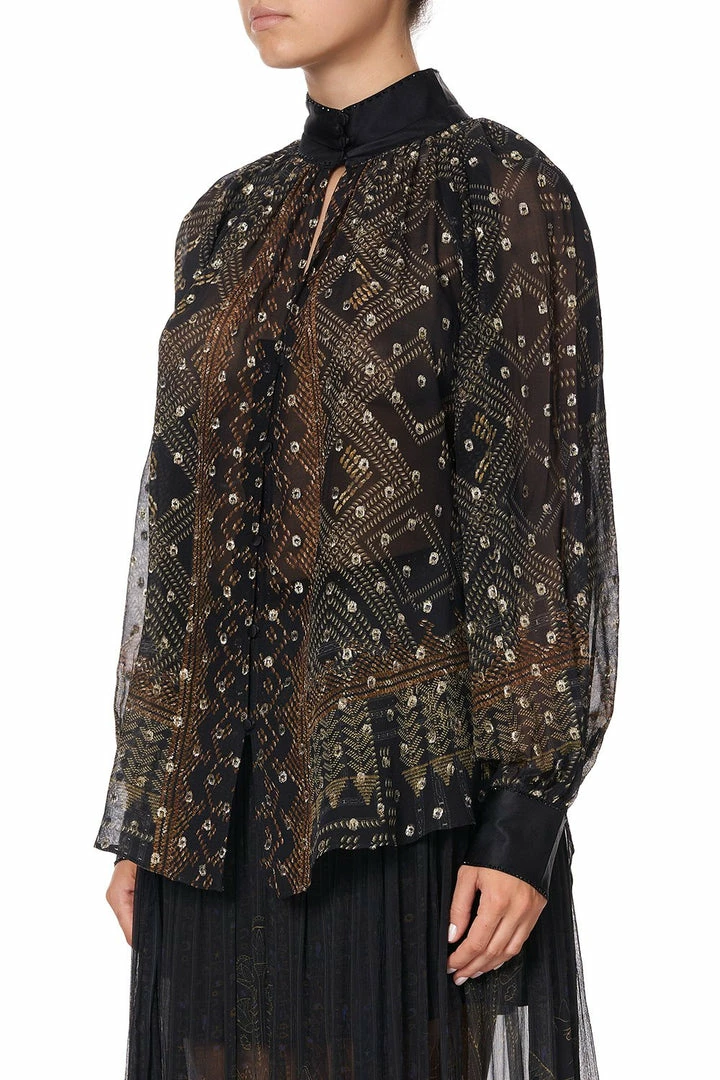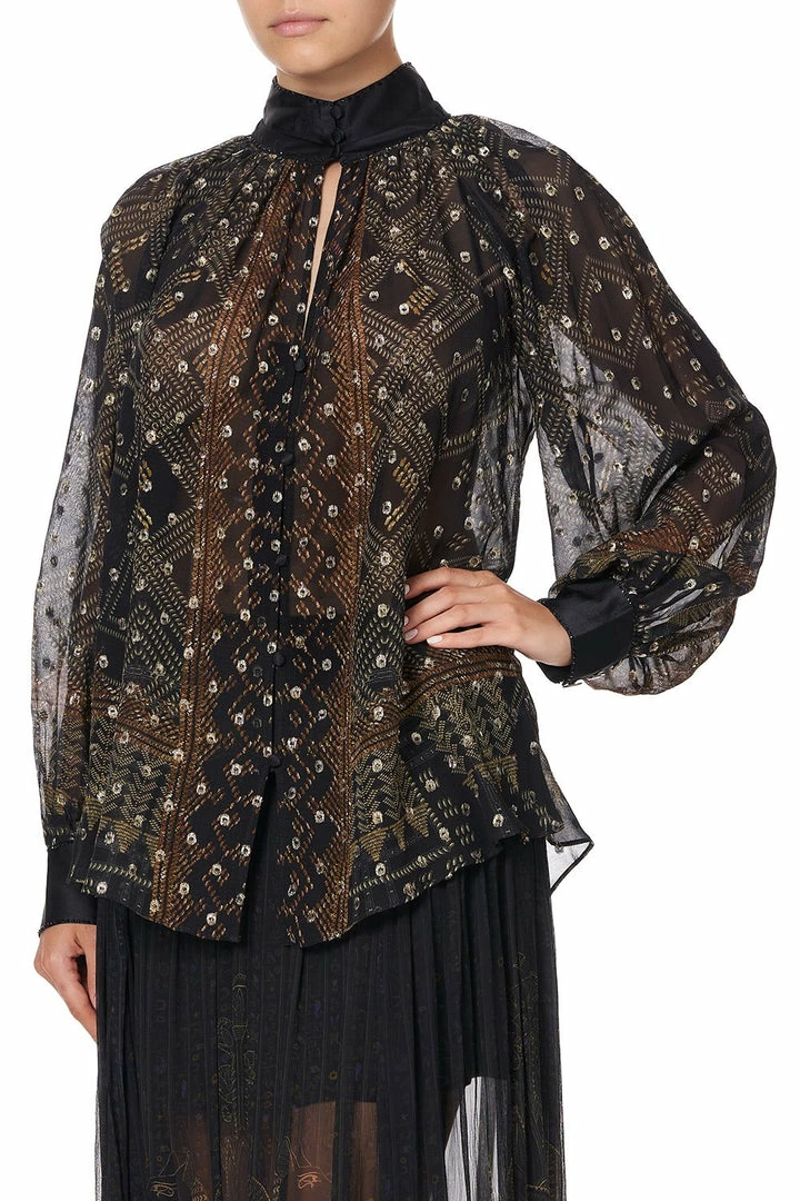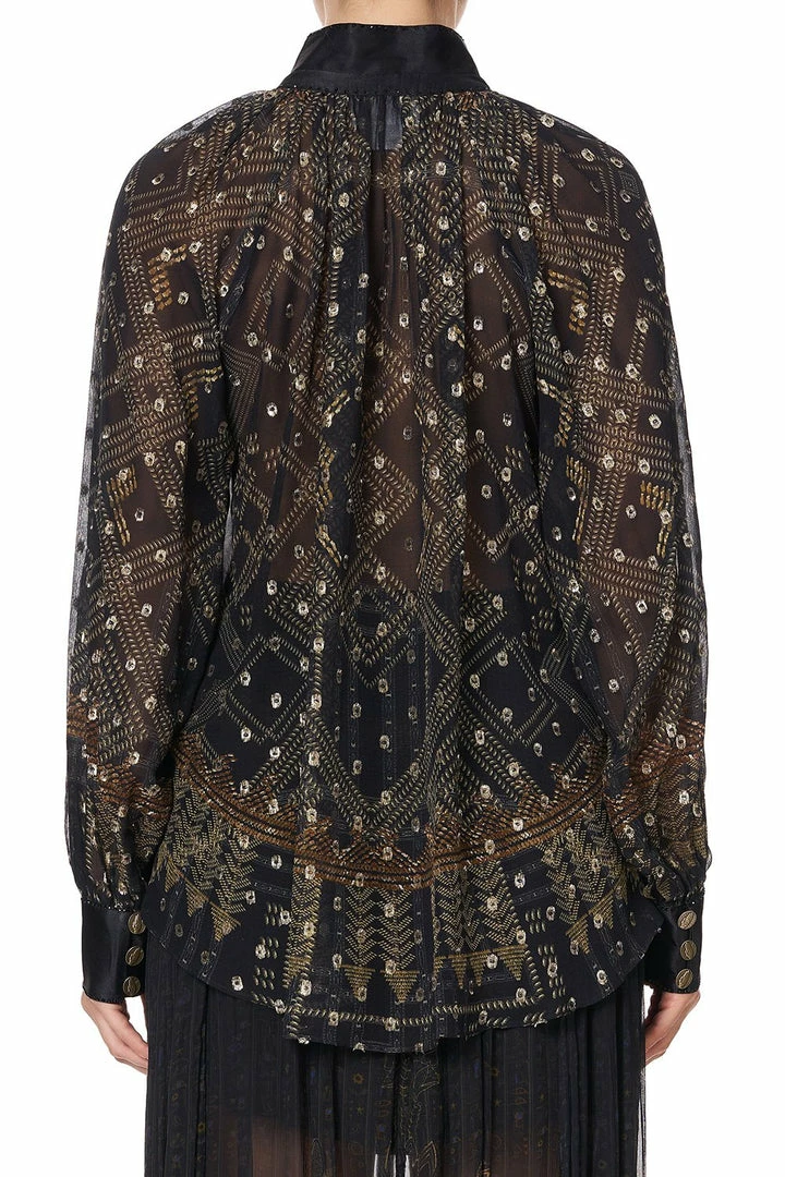 A bold black statement blouse radiant gold line work, the Cobra King Raglan Button Up Shirt honours studies of ancient Egypt. Crafted in an opulent printed CAMILLA silk, this semi-sheer blouse features boho blouson sleeves finished with chic button cuffs, a striking high collar and gold dot work. We love to style with leather trousers.