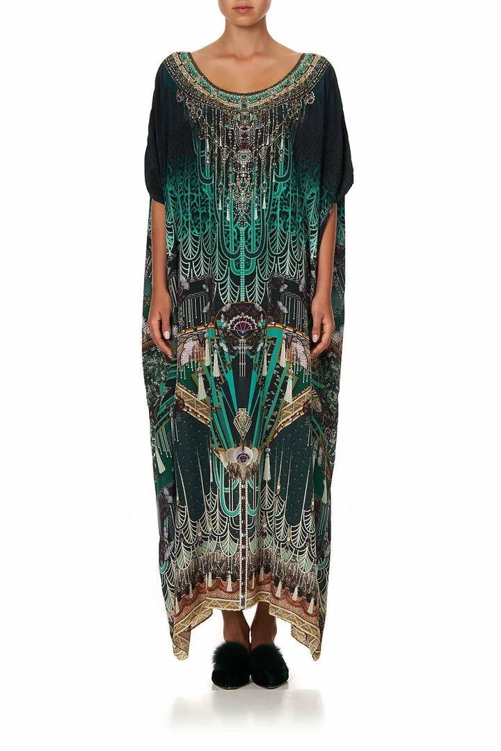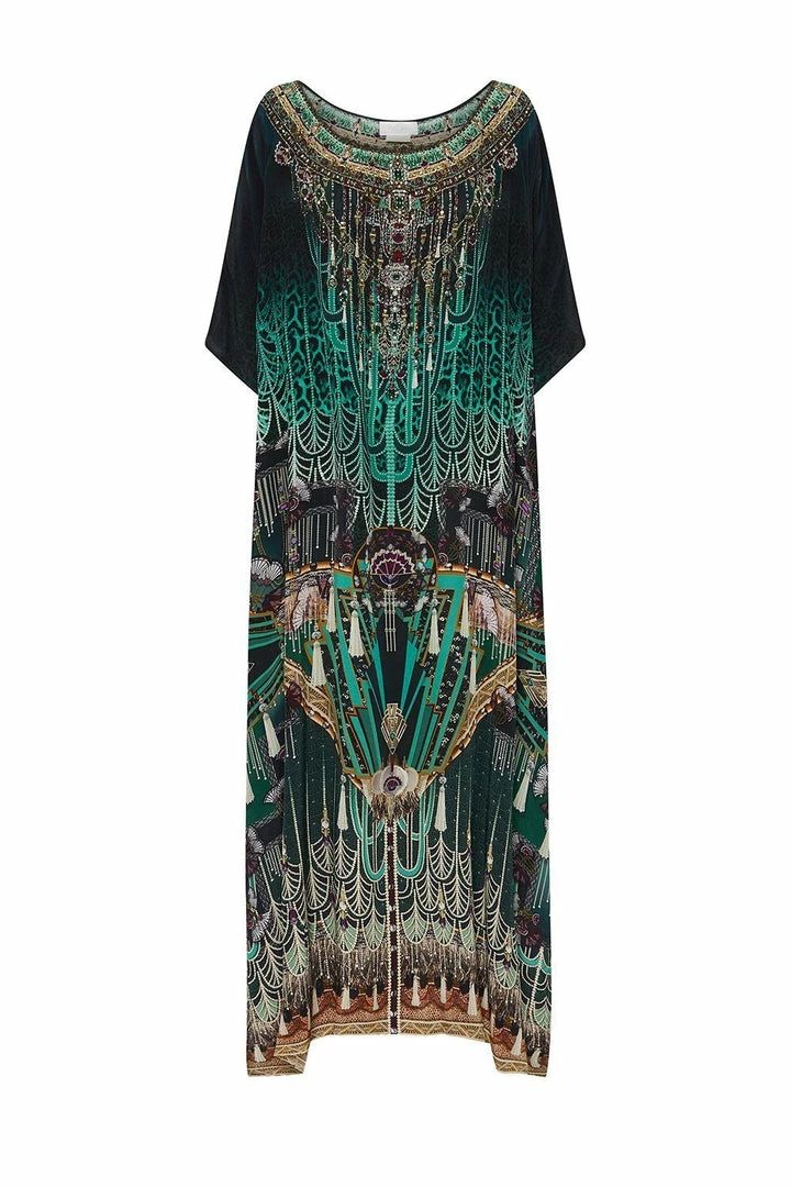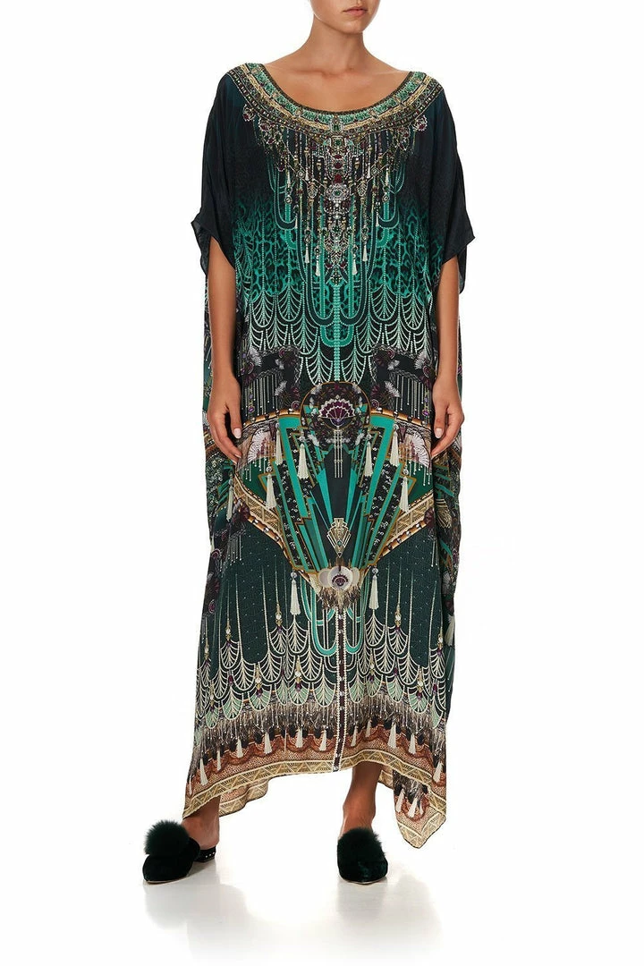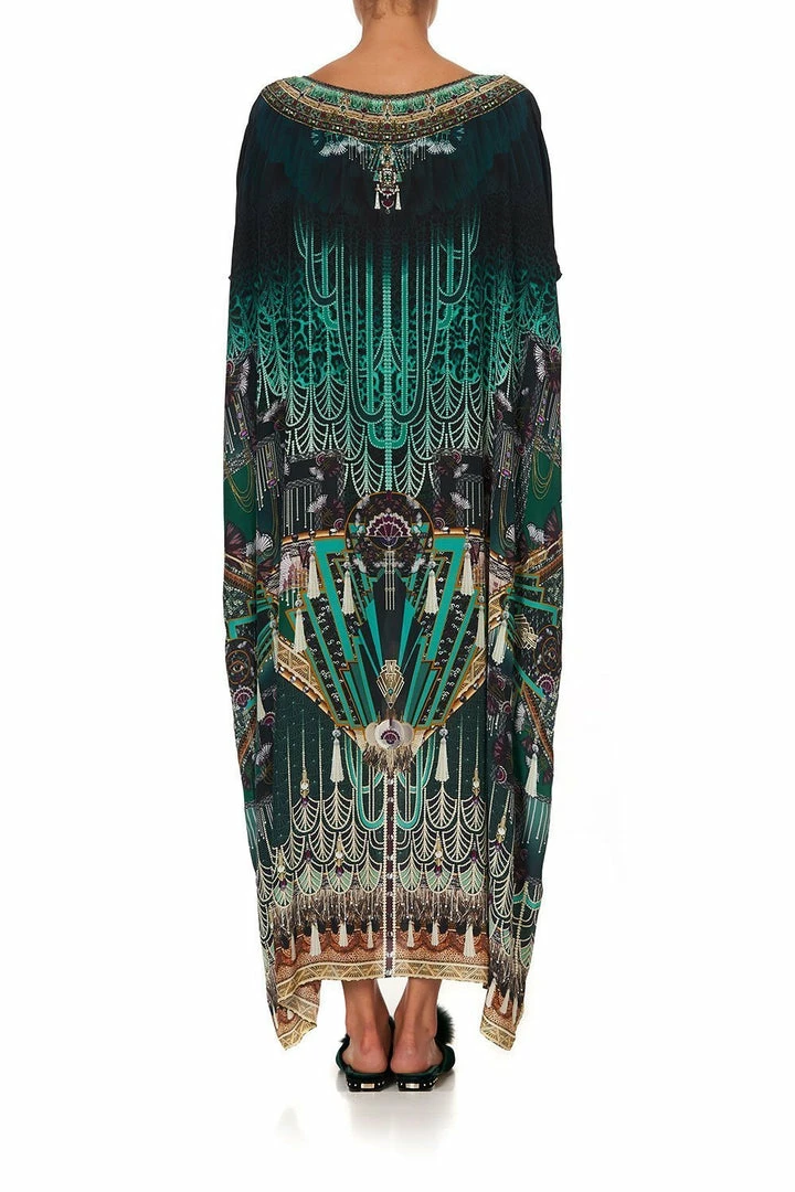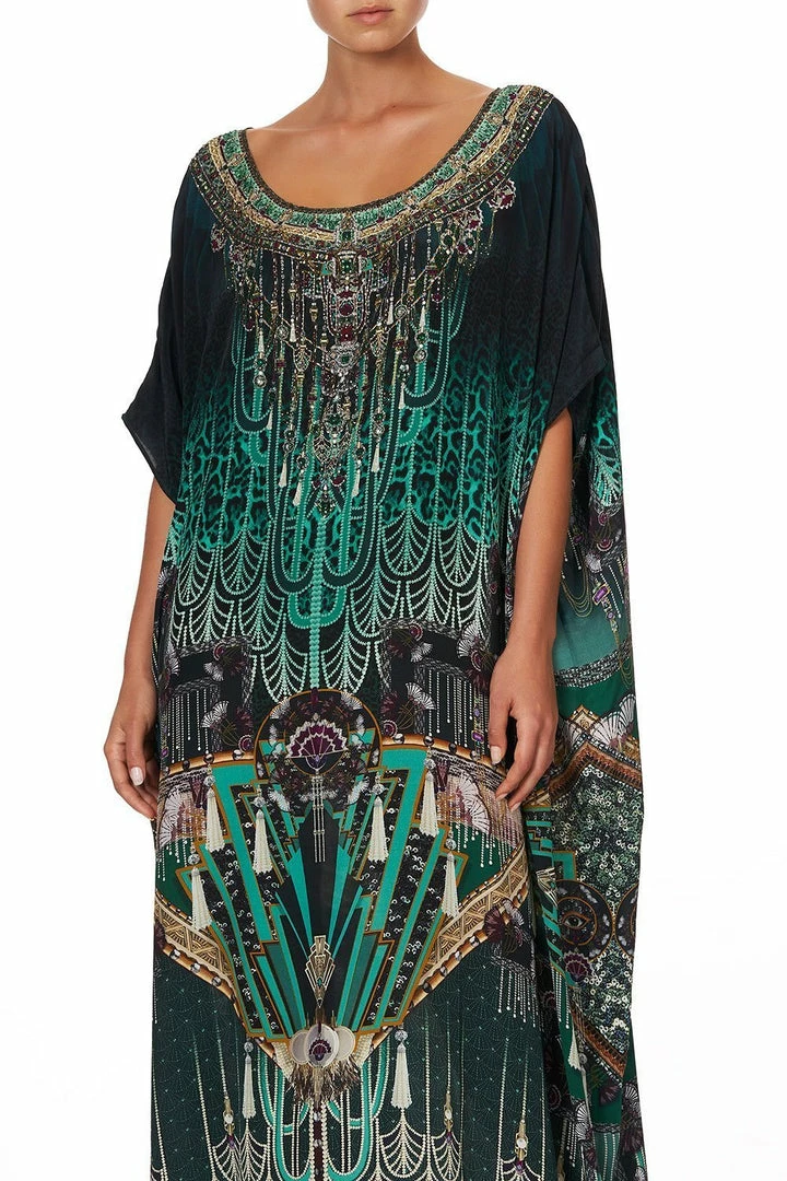Enchant in the emerald dipped and gold gilded rendition of the classic CAMILLA silhouette, the Fitzgeralds Flapper Round Neck Kaftan channels the opulence of the twenties with its symmetrical feather prints. Cut for a relaxed fit, the kaftan drapes the body and features ¾ length sleeves and a rounded neckline bordered with CAMILLA crystals. Playfully wear the kaftan off the shoulder or experiment with the plethora of styles for every occasion, like the keyhole front for a night out or a halter dress for by the pool.
