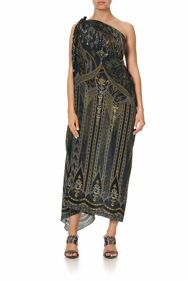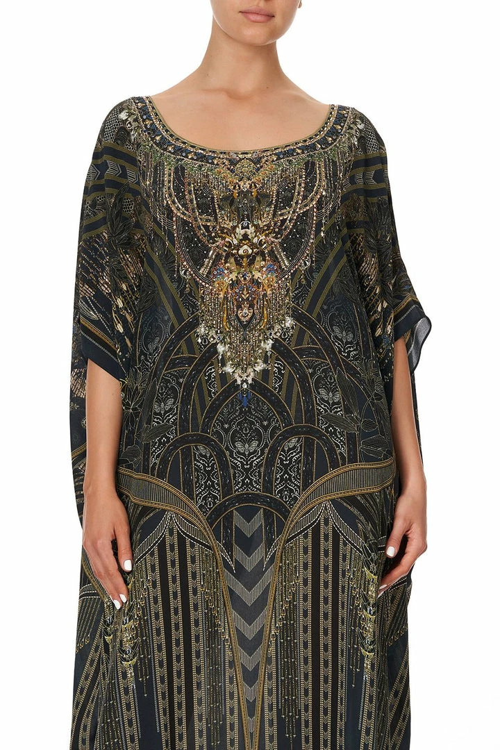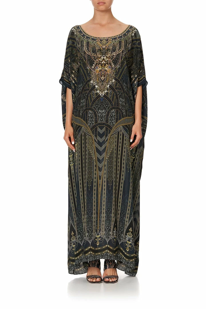 Crafted in silk reminiscent of the decadence of a party palace, the Great Scott Round Neck Kaftan has a relaxed fit and ¾ length sleeves. The decadent deco inspired design is hand embellished with CAMILLA crystals. Wear it free flowing, off one shoulder, or tied up as a mini dress for those balmy summer evenings. To discover more ways to style, visit the CAMILLA style guide.