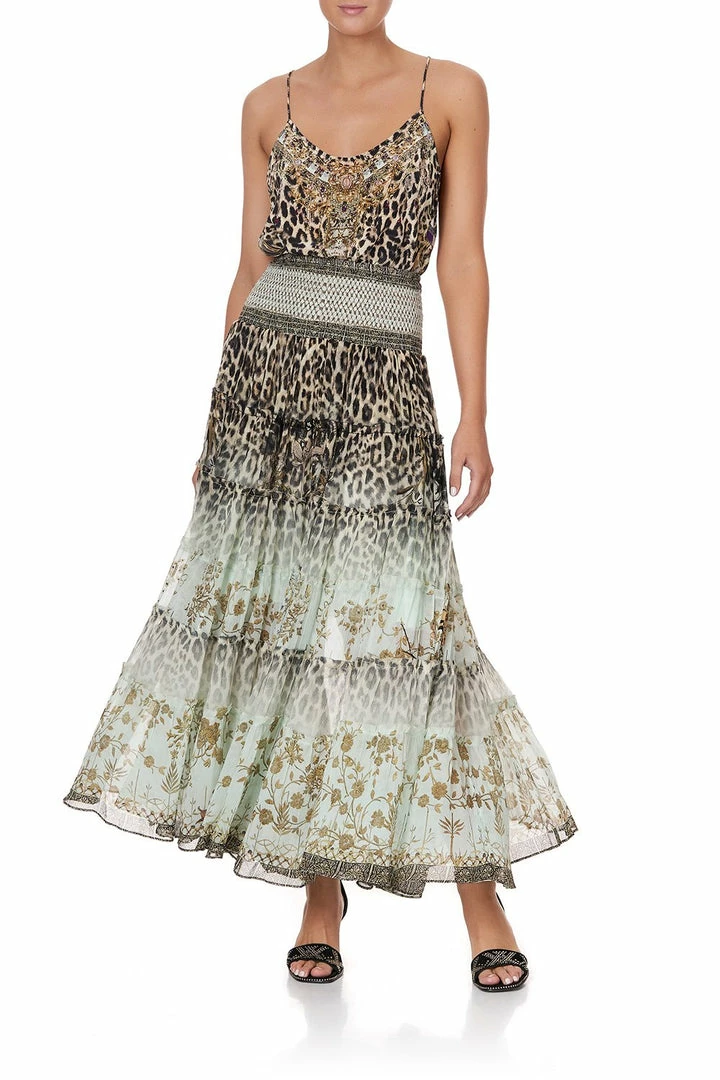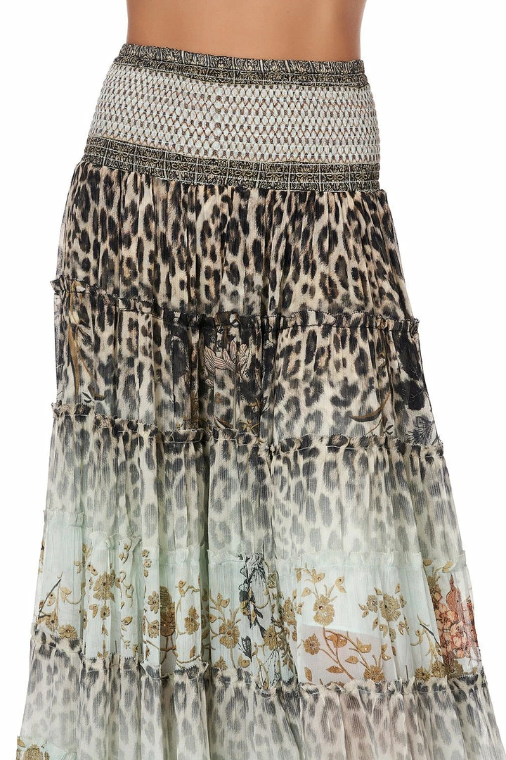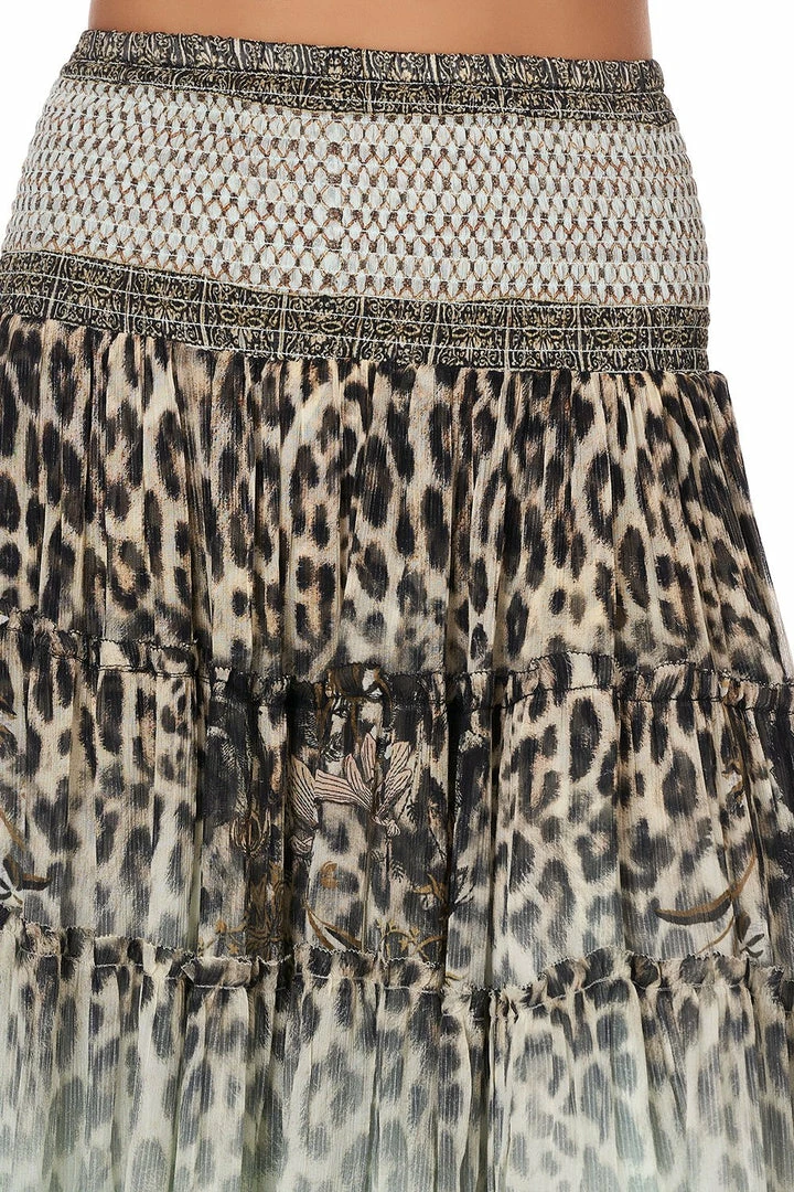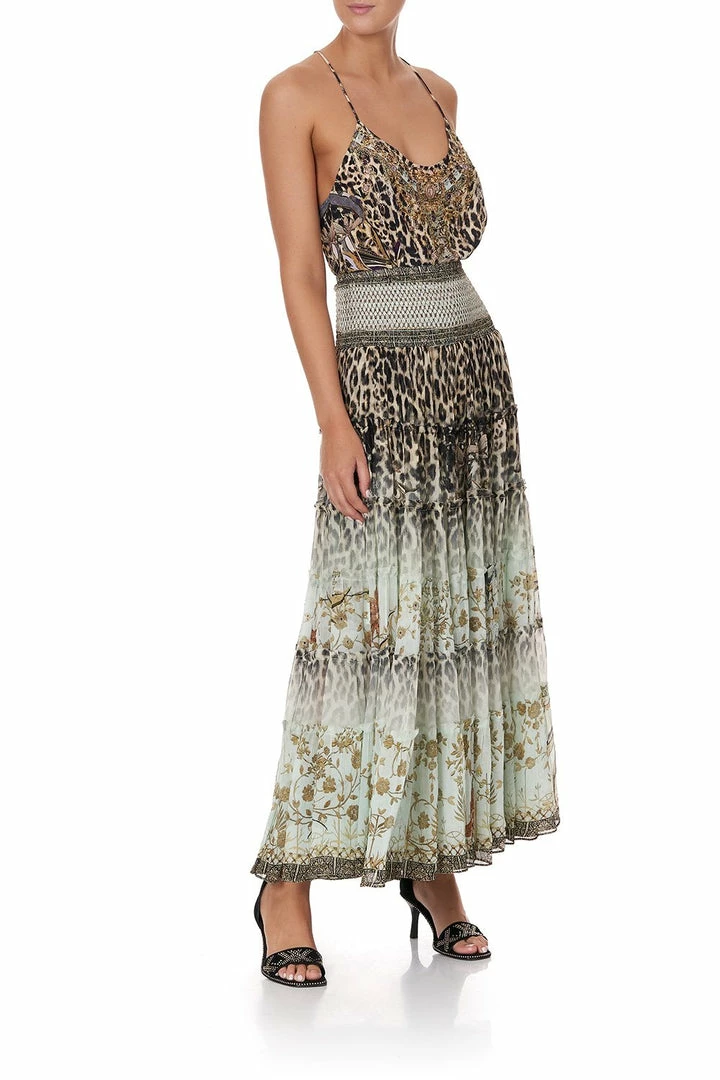A bohemian floor length opulence, the Nomadic Nymph Sheer Tiered Maxi Skirt boasts a decadent and dramatic leopard print backdrop with elegant gold fairytale features. This floor length maxi skirt has a shirred elasticated waistband, a tiered silk silhouette and a relaxed full shape. Pair with the Nomadic Nymph T Back Shoestring Top for a refined romantic ensemble.