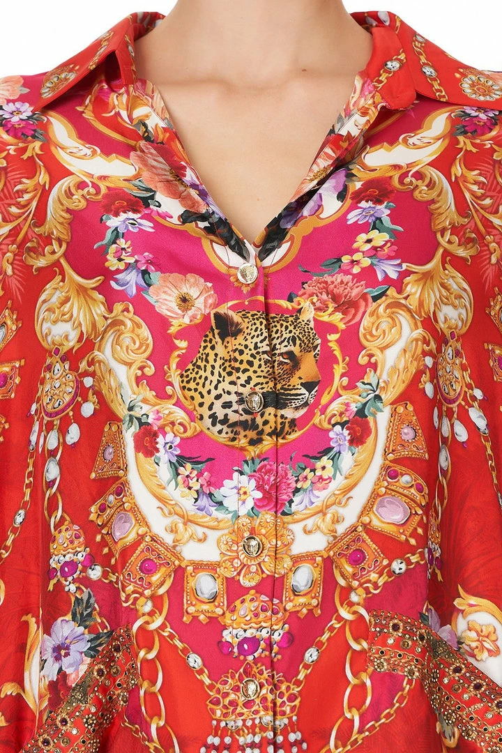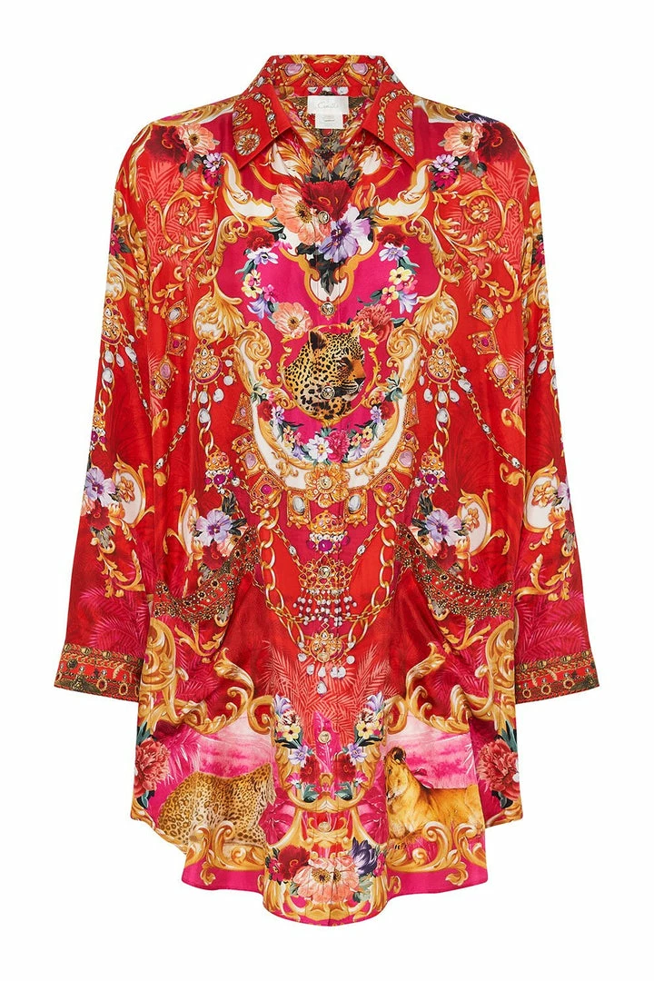 Reimagine the button-up in delicious hues this party season and beyond with the Prima Donna Shirt Tunic With Pockets. Crafted from rich silk, inspiration came calling from the extravagance of the naughty nineties. Bold crimson red adds intrigue while big cat portraits, golden chains, blooming florals and pearlescent details intertwine. This statement shirt features a structured collar, contrast crystalised cuffs and pockets and a curved hemline made perfect for subtle French tucks.