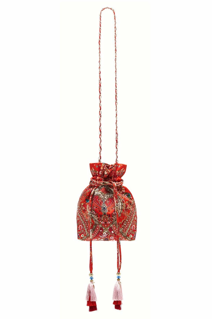 A silk interpretation of the love story of a hapless bohemian and a dazzling Parisian chanteuse, the Cameos Can Can Silk Pouch is a dreamy boho bag awash with romantic symbolism. Designed in the name of love, this drawstring bag is illustrated with French florals highlighted with hand-placed crystals and finished with tassel ties, adorned with CAMILLA love heart charms.
