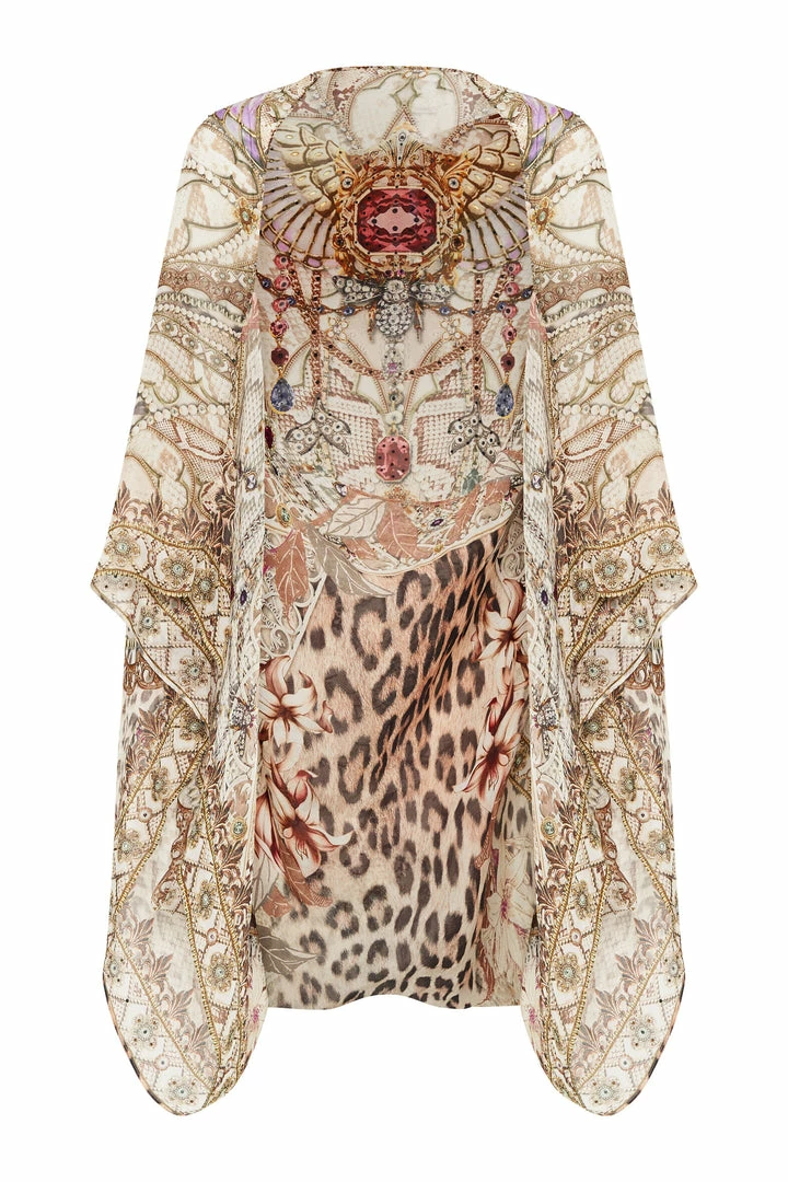 Drape yourself in the All Is Nouveau Silk Shrug is patterned with mellow leopard print amongst cream and golden hues, gleaming with CAMILLA crystals in a nod to Art Nouveau. This lavish layer is cut in a relaxed style and fitted with extra wide arm holes and boasts multi wear functionality. To be worn as a loose-fitting kaftan or tied at the waist as a sarong over swimwear pieces from the All Is Nouveau collection.