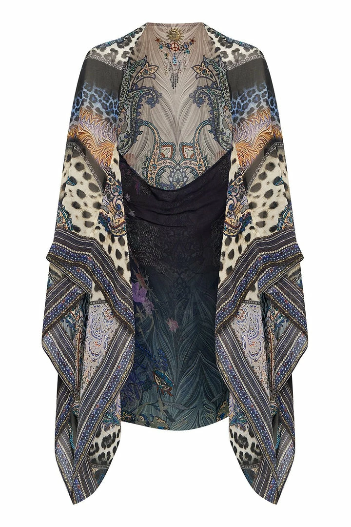 A lush layer enchanted by the stories of Janis Joplin, the Festival Express Silk Shrug is an opulent layering piece to throw over for any occasion. Inspired by the electrifying persona of Janis Joplin and her unbound freedom flowing within her. This blue and animal print silk shrug features a billowing printed silk, statement extra wide arm holes for a super relaxed fit and iconic hand placed CAMILLA crystal embellishments. Pair with matching Festival Express swimwear pieces for the ultimate resort luxe look.