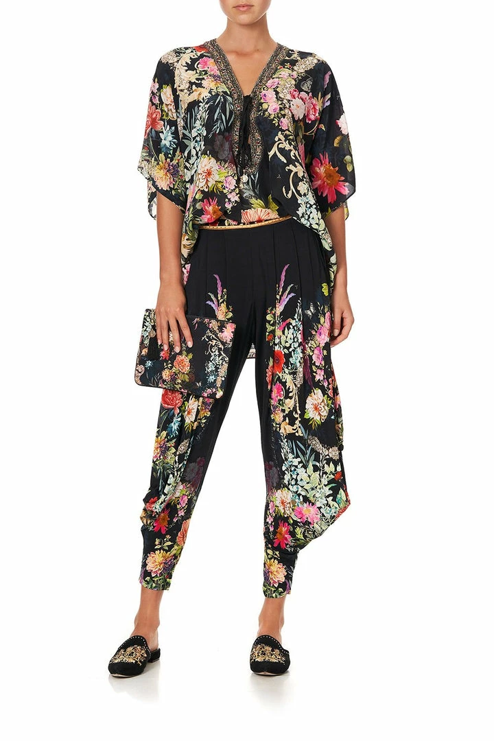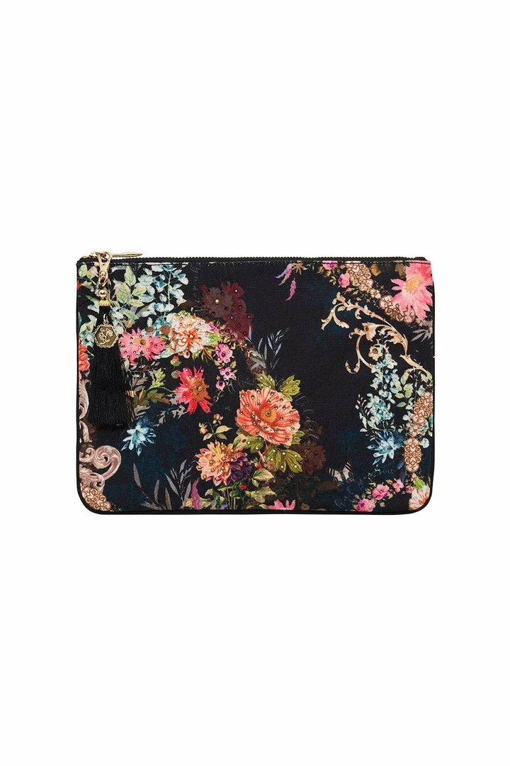 Add vibrant florals to an outfit with the Hampton Hive Small Canvas Clutch. This printed canvas purse is a welcome addition to a wedding guest ensemble or vacation look. Featuring two zip compartments and charming details such as a parrot clip and tassel, its adorned with a black floral print inspired by English gardens and antique markets.