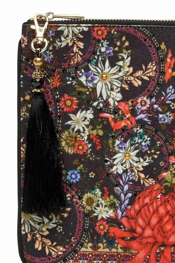 Enchanted by the blooming bush botanicals of the Blue Mountains, the Ms Matilda Small Canvas Clutch is proudly lavish. This printed purse features tassels, practical parrot clip, internal zip pocket, as well as hand-placed crystals as detail.