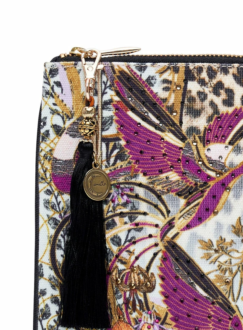 An iconic CAMILLA accessory keepsake purse, is crafted in soft canvas printed with glistening fairytale accents across a roaring animal print backdrop.This printed purse features charming tassels, practical parrot clip, internal zip pocket, as well as contrast piped edge. Perfect for safely storing the essentials whilst offering an element of statement luxe to any outfit.