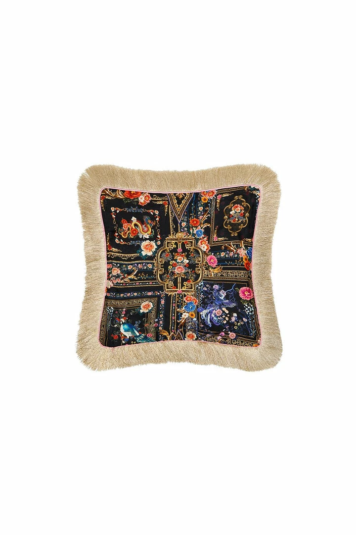 Add an accent of colourful anarchy to your home with the Party In The Palace Small Square Cushion, inspired by a rebellious princess. Bold pops of colour intermingle with floral accents and hand-placed CAMILLA crystals, framed with a contrast piped edge and fun tassels, to create this pure silk home accessory. Add on its own for a statement burst of colour or layer with other cushions from the collection for a vibrant display.