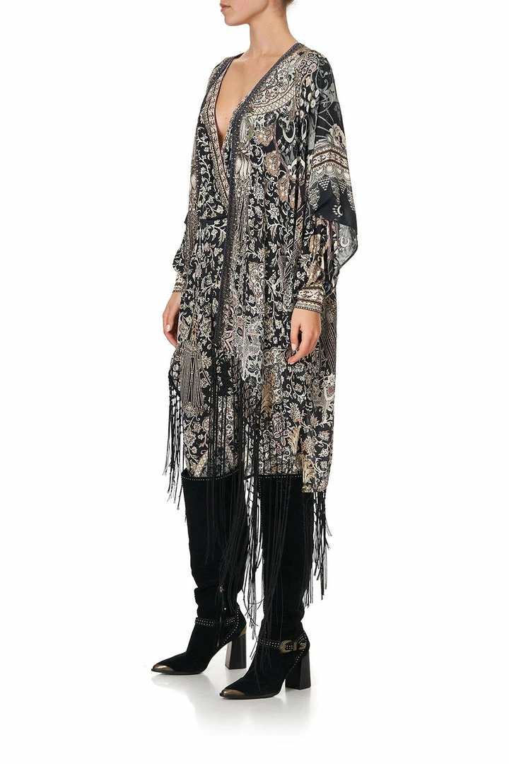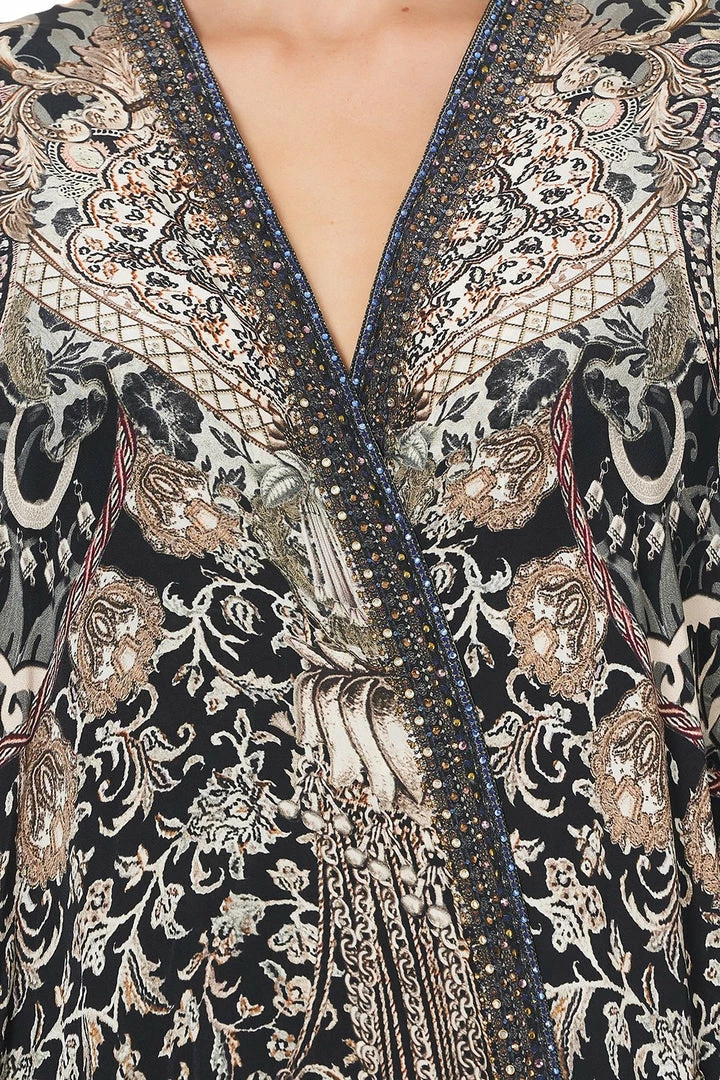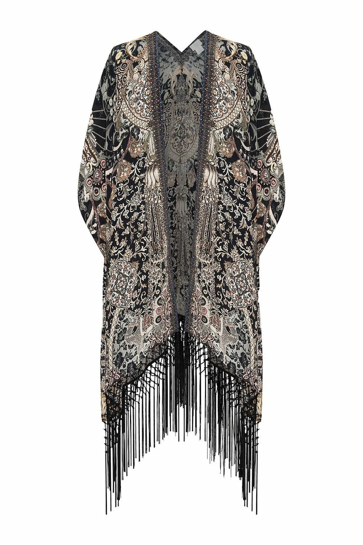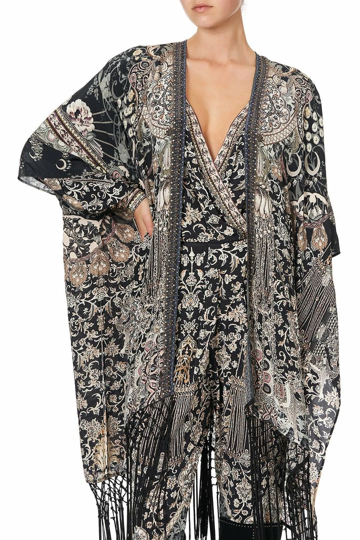 Wrap yourself in timeless style with the Dust Her Off Square Draped Layer. The intricate print on this glamorous kaftan is inspired by antique relics – brimming with soft pink florals set against sultry black silk. CAMILLA crystals and tassel fringing add touches of glamour while side splits give it movement. Pair with jeans for a casual look or team with matching prints for some wow factor.