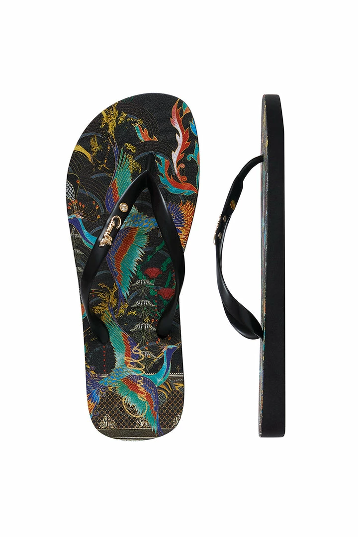 A set summer essential footwear reimagined with a scene of Persian folklore creatures during their night flight, the Wise Wings Thongs are a chic addition to a luxe resort wear wardrobe. Crafted with a soft printed rubber, they feature a CAMILLA logo and crystals. Both comfortable and chic, pair back with matching resort silhouettes for a head to toe luxe life look.