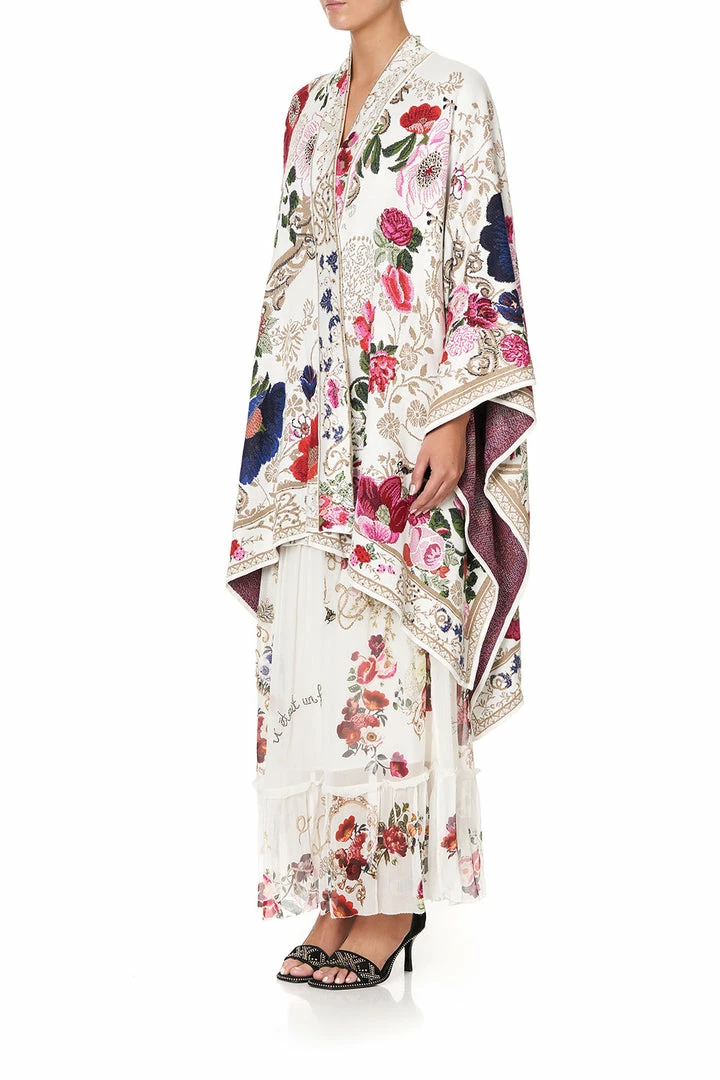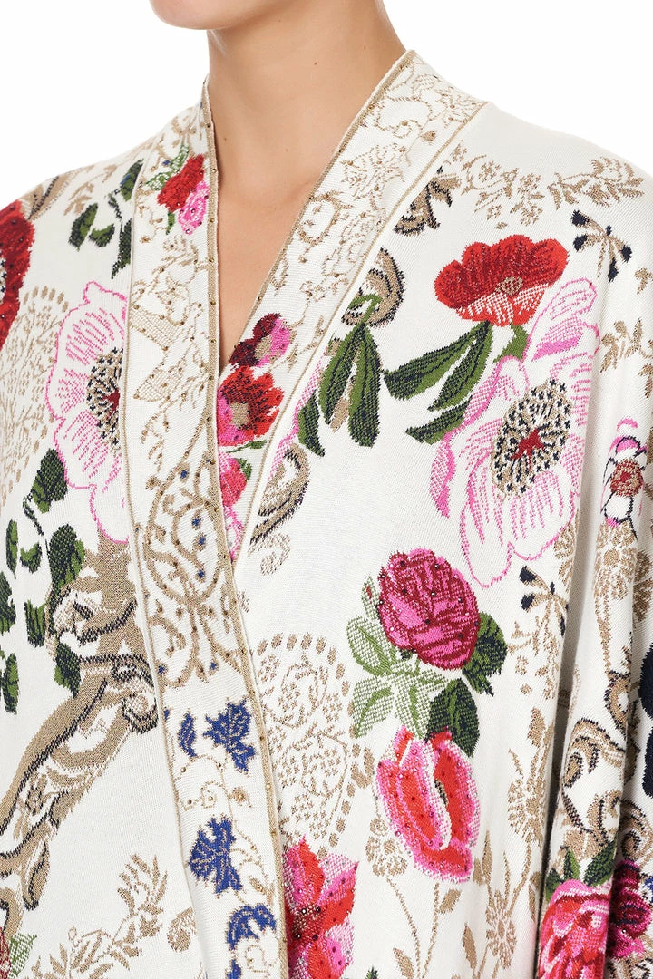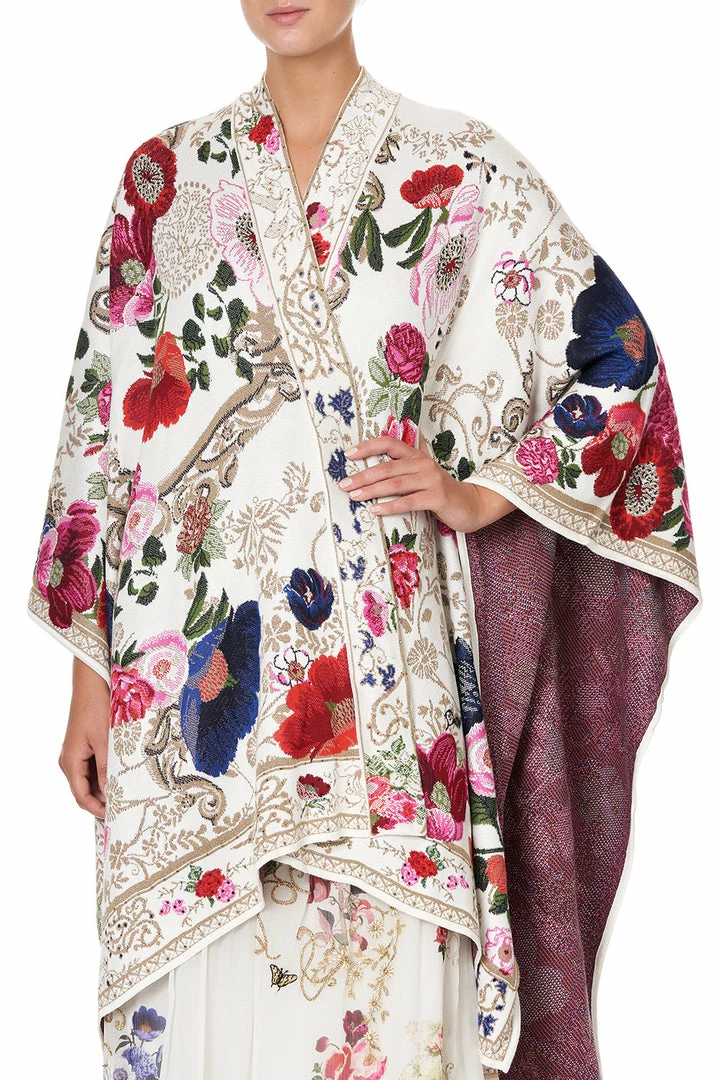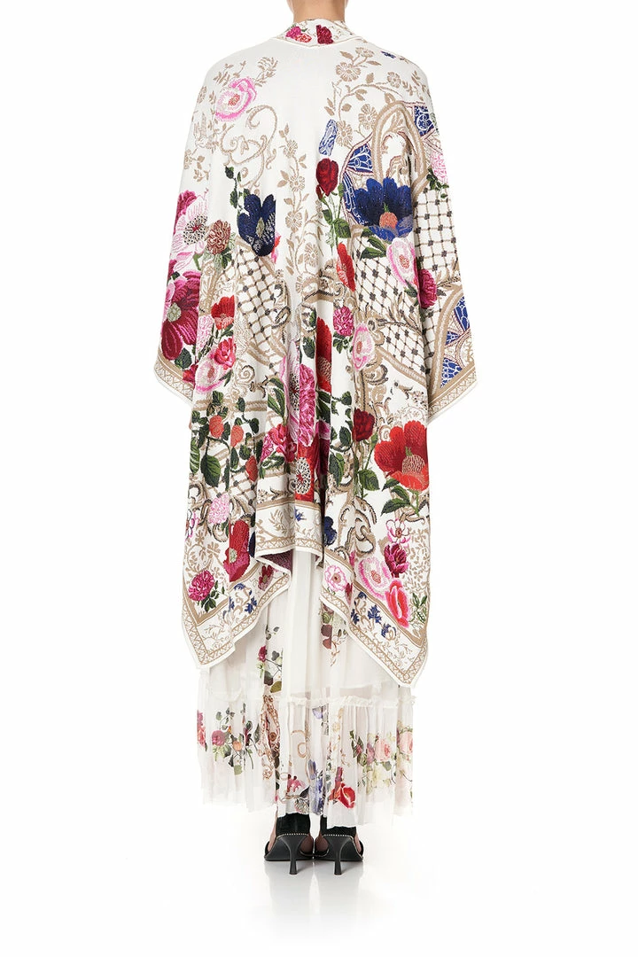 A layer of magical warmth enchanted by studies of fairytales, the Fairy Godmother Throw Over is heavenly opulent. Crafted in a soft white-based knitted jacquard showcasing a floral design, it features an artisan boarder at neckline and hem and is finished with a glittery array of CAMILLA crystal embellishments. Wrap over matching print pieces for an ethereal winter ensemble.