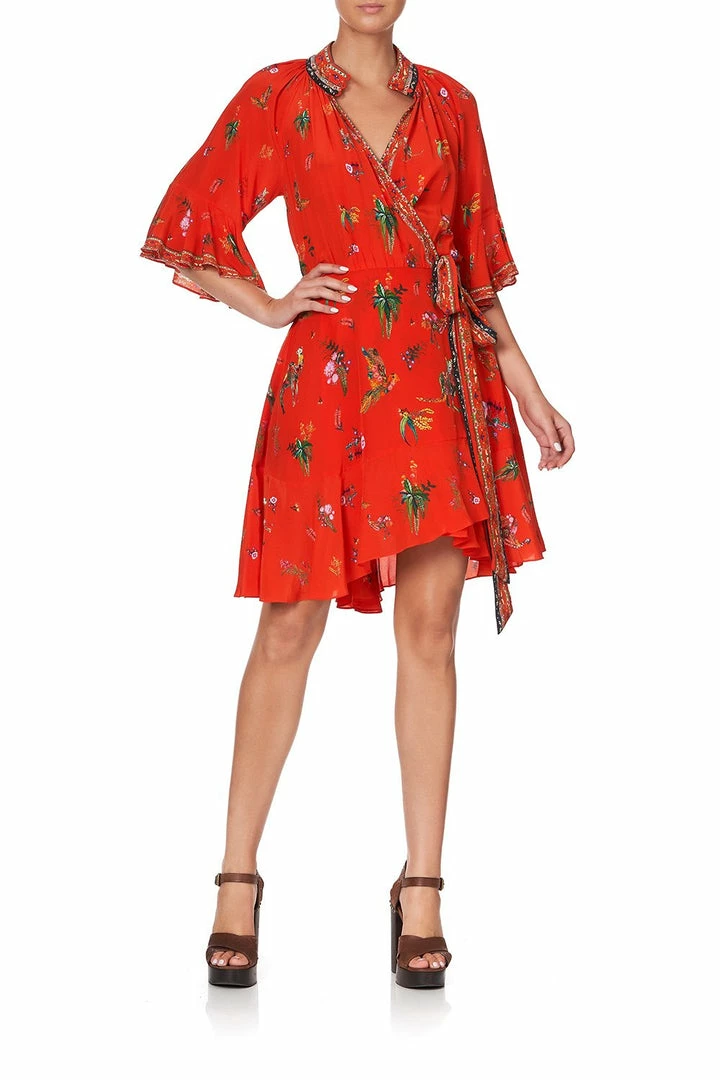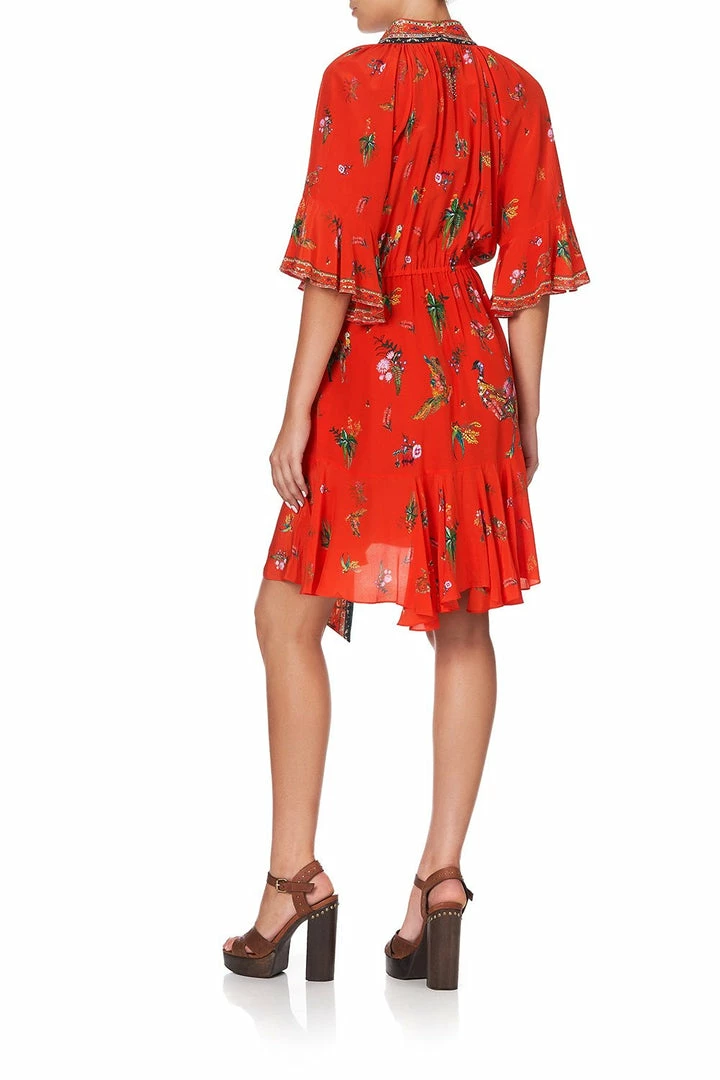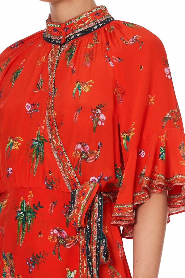 A dreamy boho statement dress with vibrant hues dancing across a red canvas of the Daintree Rainforest’s lively wildlife, the Cinema Paradiso Wrap Dress with Raglan Sleeve is vibrant bliss. This floaty silk dress features an alluring button neckline, sumptuous wide sleeves with frill, kimono-style side tie, digitally printed silk, as well as delicate neckline crystals as detail. Wear open simply over swimwear for an effortless resort look, or wrap closed for an elevated summer outfit.