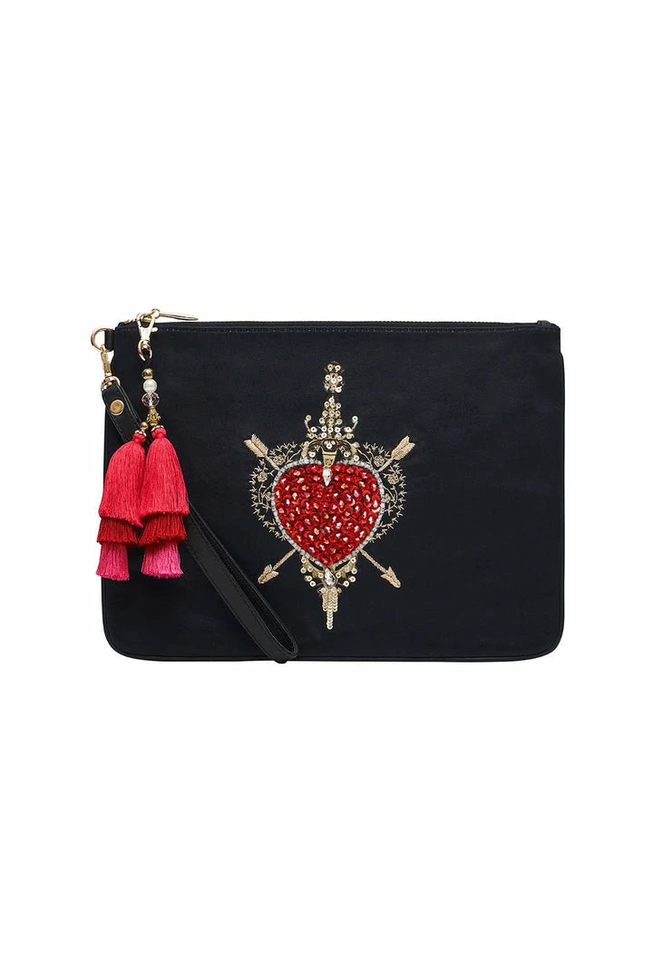 An effortlessly chic statement clutch, the Mirror Mirror Zip Top Clutch with Wristlet is enriched with a print inspired by studies of Cinderella. Crafted from a soft printed silk designed with a bespoke CAMILLA print, it features a practical parrot clip, internal zip pocket, a lightweight leather wristlet, as well as hand-placed crystals, beaded embroidered and tassels as detail. Perfect for safely storing the essentials whilst offering an element of statement luxe to any outfit.