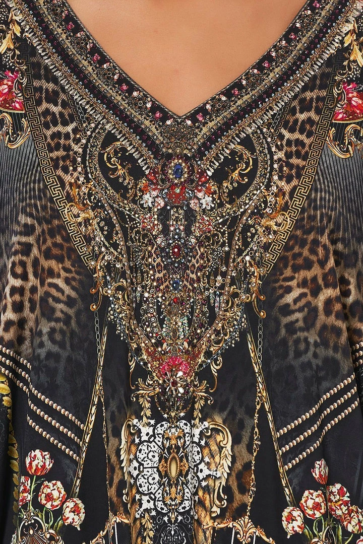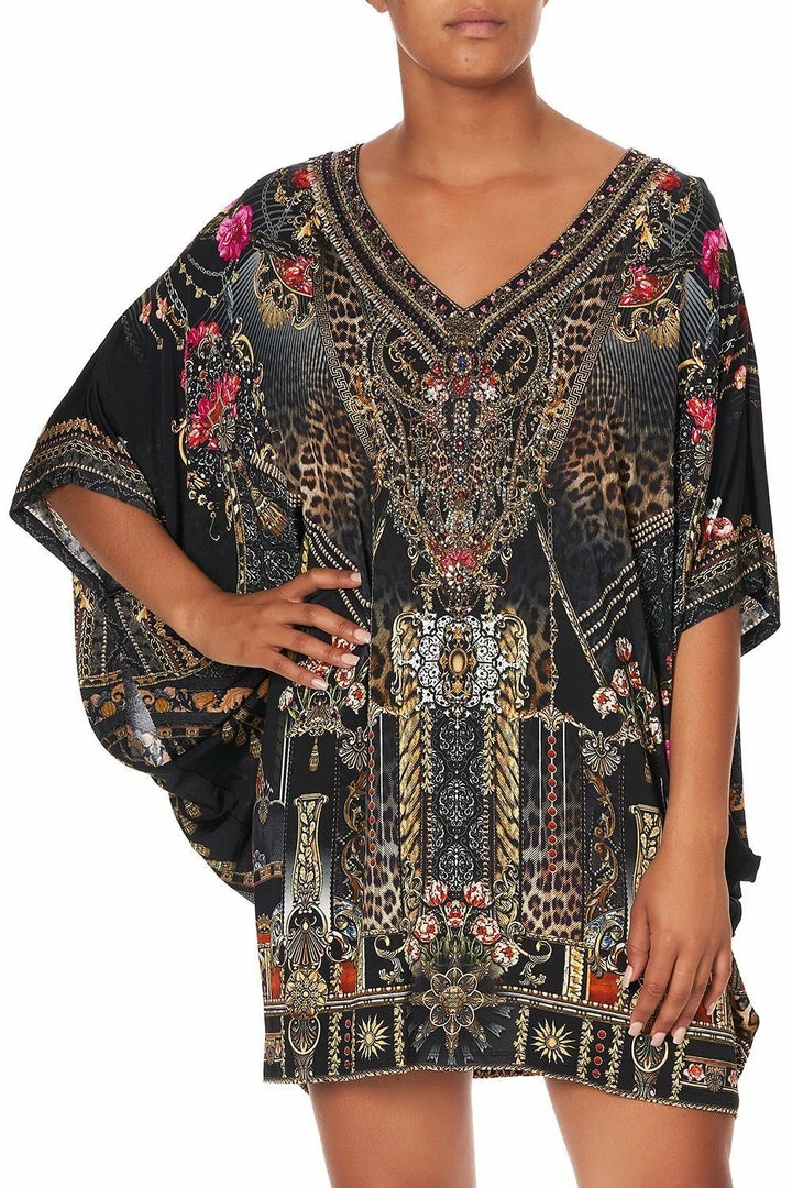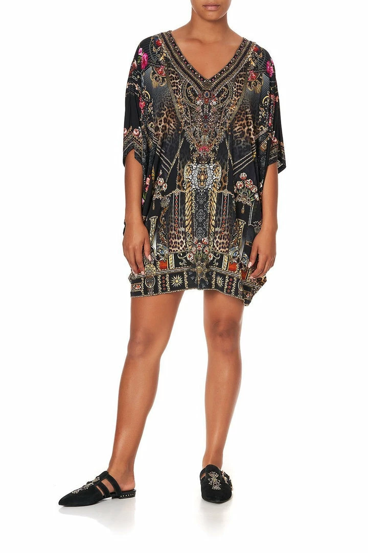 A short statement dress inspired by the ornate cathedrals of the Middle Ages, the Gothic Goddess Bat Sleeve Dress flaunts an all-over print of floral blooms and leopard spots amongst gilded spires. The relaxed fit jersey kaftan features a flattering V neckline adorned with hand-embellished CAMILLA crystals and draping sleeves. For a formal occasion pair with a statement clutch and the Luxe Black Asym Heel Sandal or celebrate the casual core CAMILLA silhouette by pairing with the matching Leggings and the Luxe Black Buckle Slipper.