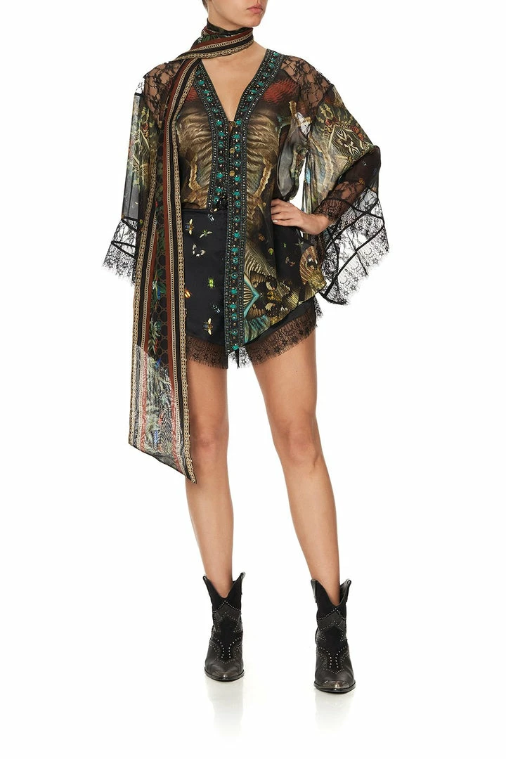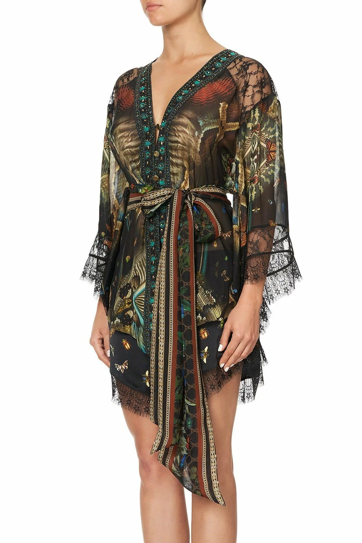 Musing scenes from the depths of the ancient Daintree Rainforest, the Maternal Instinct Kimono with Shoulder Inserts is a hypnotic retro-inspired piece that embodies resort luxe. Crafted with love in a vibrant silk canvas of Australia’s fauna and fauna, this contemporary kimono features flared sleeves, dreamy panel inserts, button front and a form-fitting sash tie. Wear over matching pants for an opulent resort look.