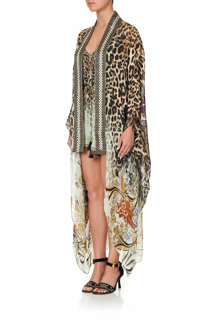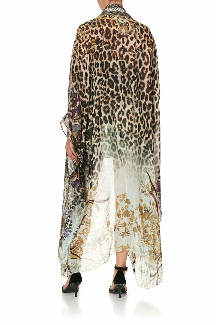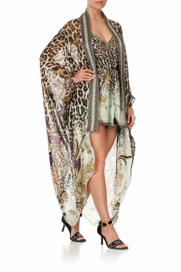 A billowing layering robe with dreamy fairytale hues, the Nomadic Nymph Layer with Kimono Collar flourishes in charming golden accents across a bold leopard print backdrop. This piece features a devine floor length flared hemline, a statement kimono collar, a loose fit flowing silhouette and hand placed CAMILLA crystal embellishments. Pair over any of the Nomadic Nymph pieces for added overage or a dramatic layered effect.