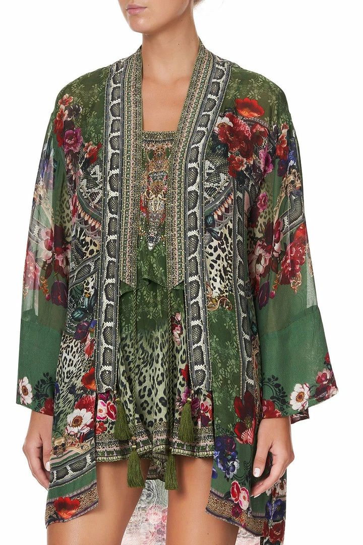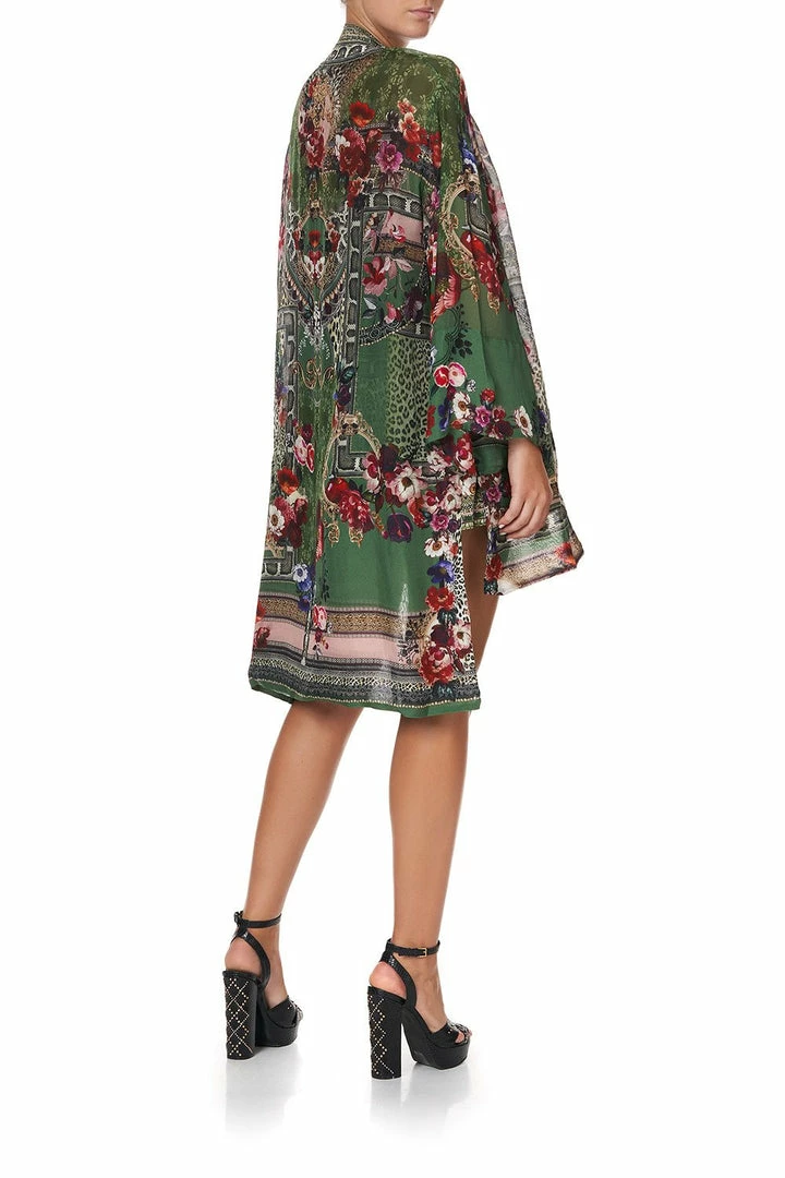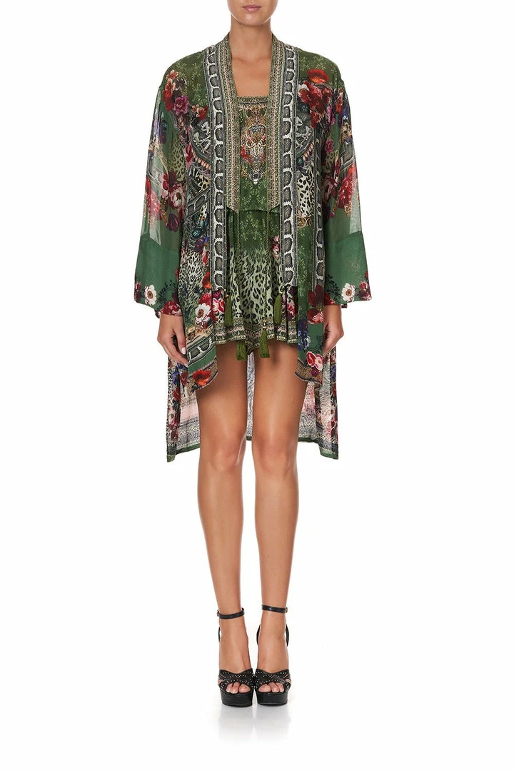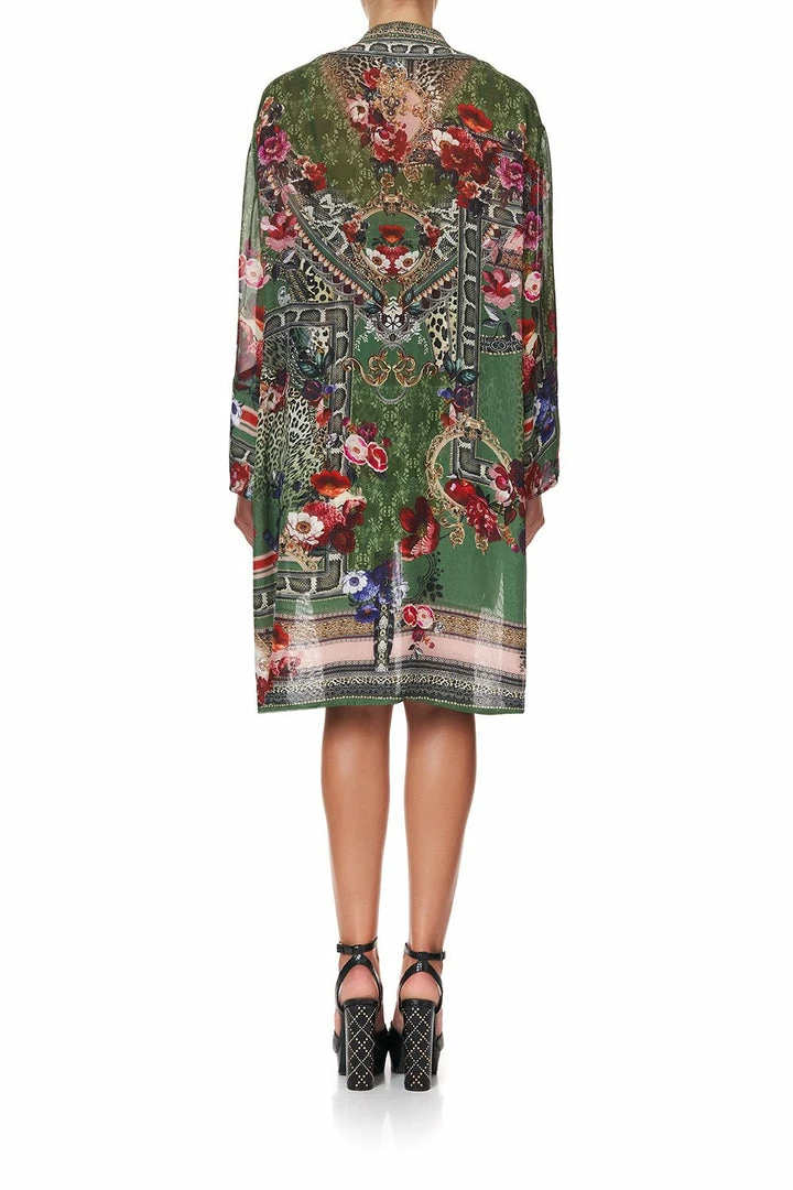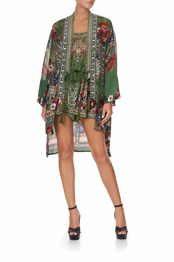 A whimsical piece of boho loungewear, the Tales of Time Layering Piece with Neck Bands is enriched with scenes of wild animals and blooming roses. Crafted in a heavenly floaty khaki silk showcasing a print of power and peace inspired by Indian emperor Ashoka, this kimono-style jacket is designed with bohemian wide sleeves and drop shoulder, side splits for added movement and is finished with a glittering array of hand-applied CAMILLA crystals. Wear over swim or pair back with matching Curved Hem Pants for loungewear luxe.