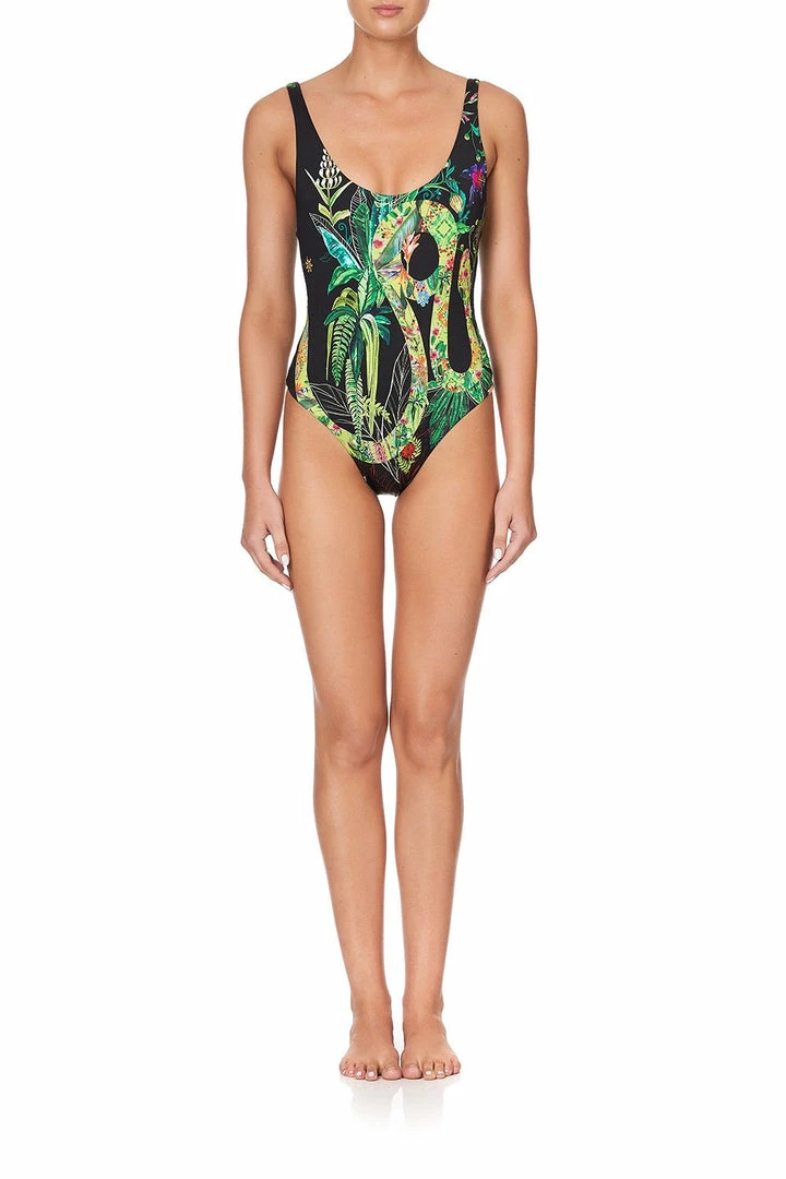 Mesmerising in form, the River Cruise Low Scoop One Piece draws inspiration from a dusk river cruise along the Daintree. This cheeky cut swim piece features an all over print, high leg, removable soft cups and is finished with CAMILLA crystals. Wear along for a striking summer swimsuit or under the matching trousers for a chic resort wear look.