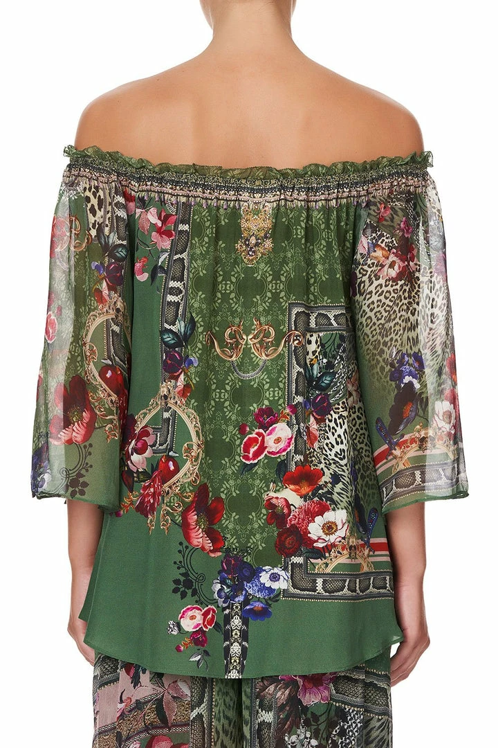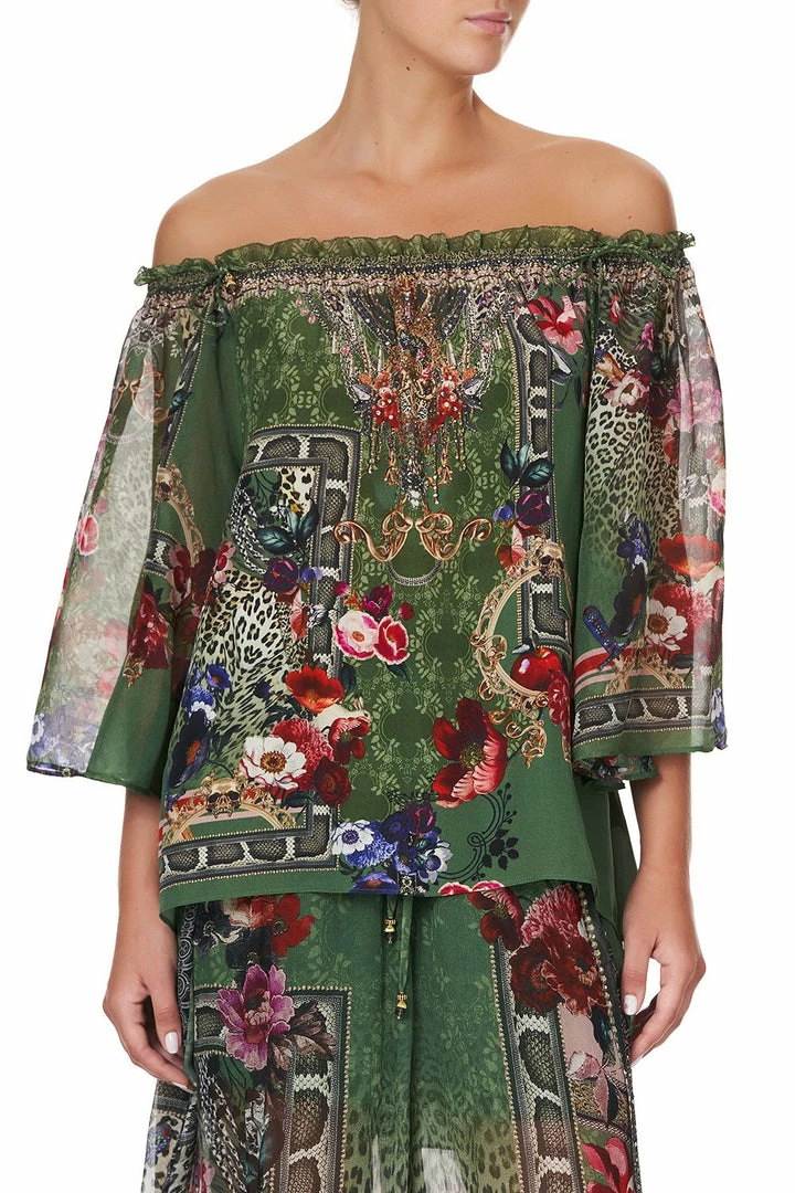 A lush silk top for lovers of mystical folklore, the Tales of Time Off Shoulder Flare Blouse is enchanted with hues of khaki and rose. Crafted with a heavenly printed silk which entails a story of power and peace inspired by Indian emperor Ashoka, this floaty boho top features a comfortable elasticated neckline for free movement, feminine tie details and is finished with hand applied CAMILLA crystals. Pair back with matching Tales of Time Curved Hem Pants.