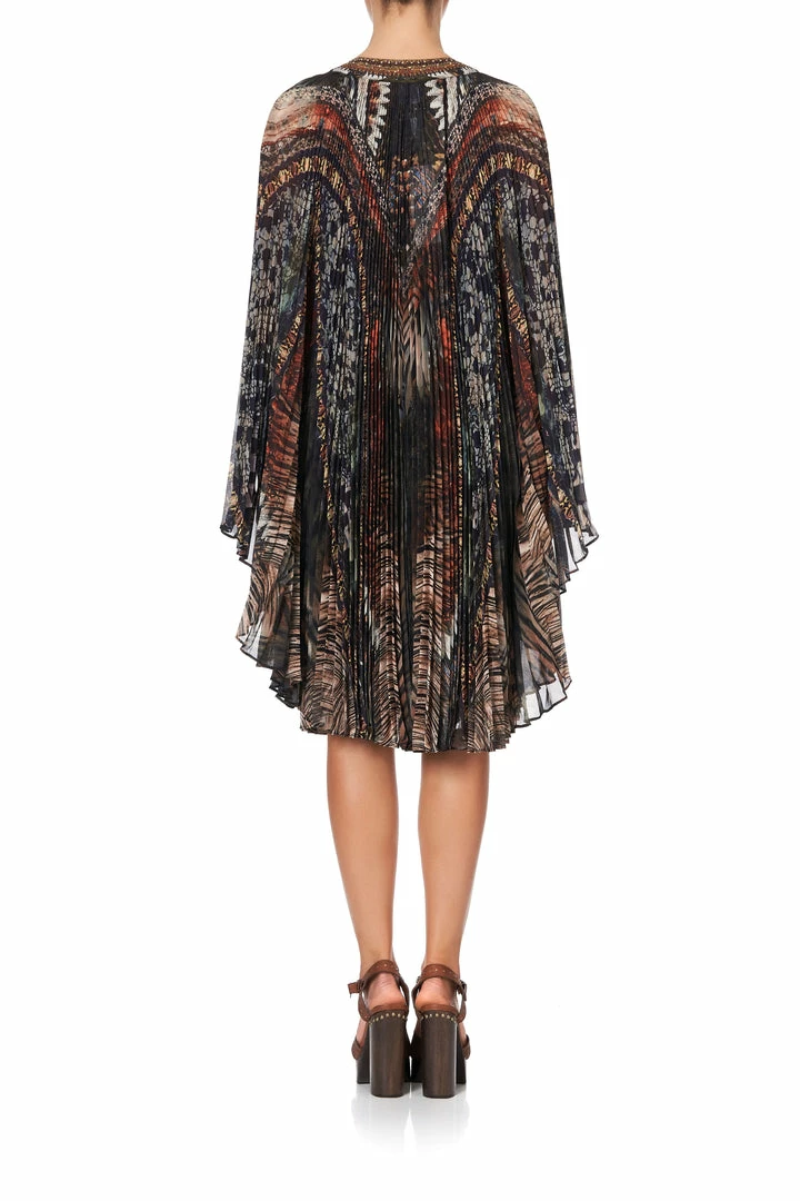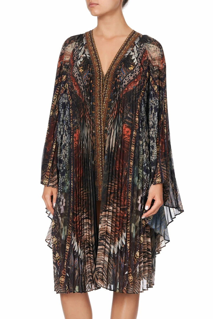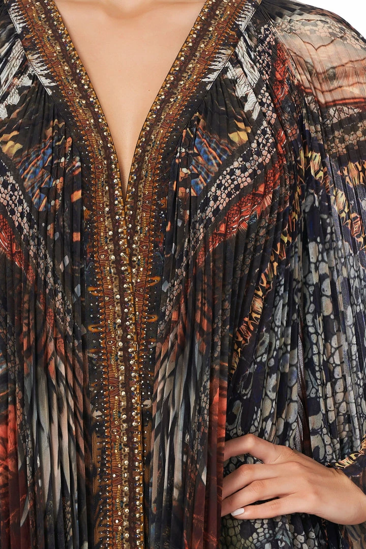 Inspired by scenes set against the burnt horizon, the Kakadu Calling Pleated Layer takes homage to the wildlife that call Australia home. This opulent pleated robe features digitally printed silk, crystal embellishment along the neckline, a curved hem and contrasting neckband to finish. A true statement piece.