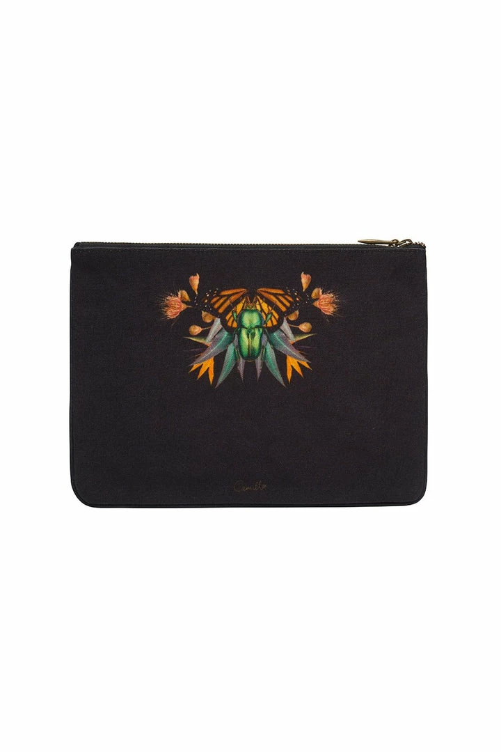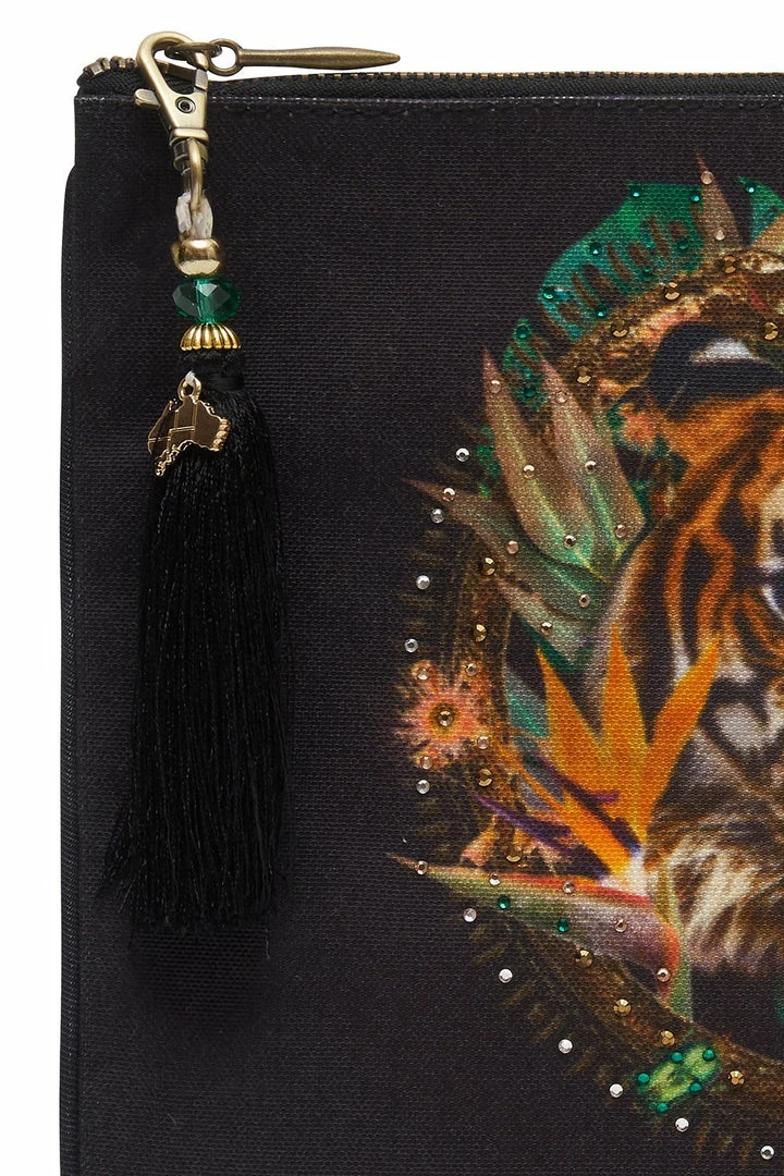 Placement print purse, the Solid Black Small Canvas Clutch is inspired by roaring tropicals, exuding exotic charm.