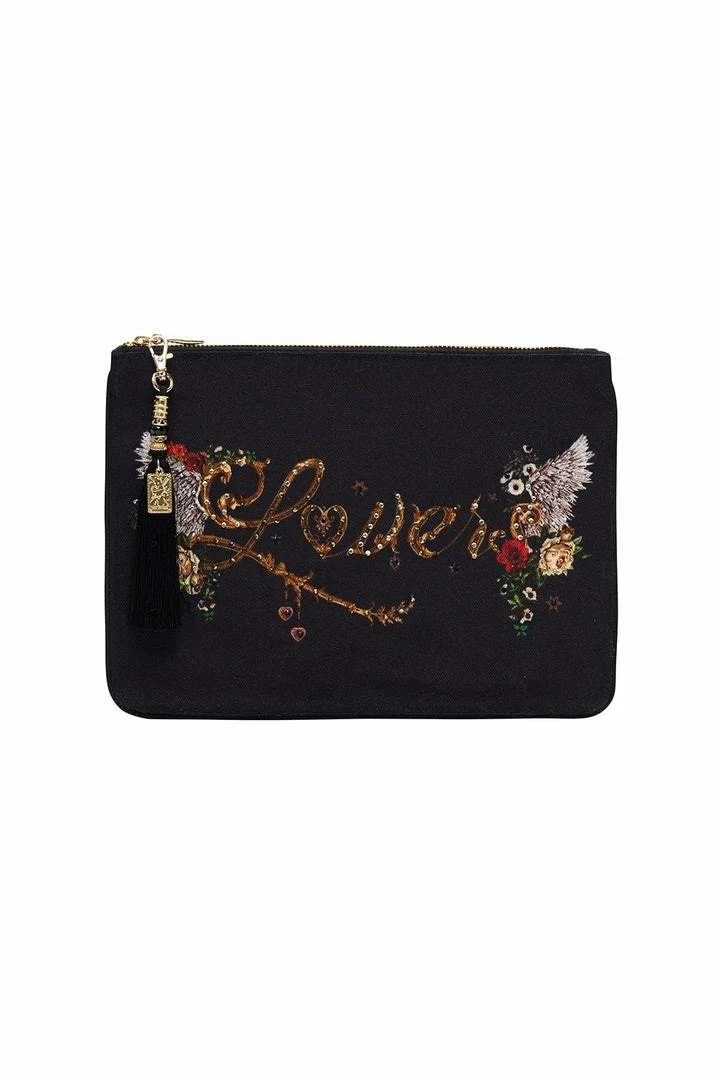 Wear your heart on your sleeve with the pirate inspired Solid Black Small Canvas Clutch. The solid black canvas material is emblazoned with statement lettering embellished with CAMILLA crystals and tassel with CAMILLA charm. Featuring two zip compartments and measuring 26xm x 18.5cm, this statement purse is perfect for storing cards and a phone.