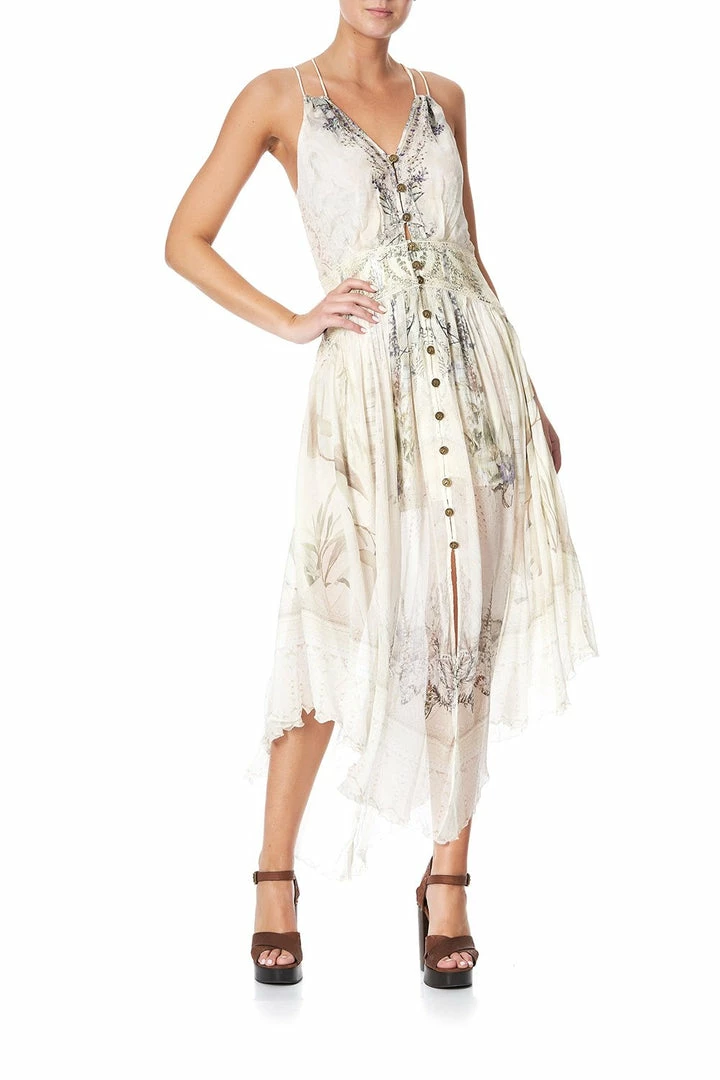 The Memories of Moree Strap Dress with Shaped Waistband honours the poetic prints of Camilla’s carefree childhood holidays at her grandmother’s home in Moree. This silk dress features adjustable shoestring straps, flattering shirring at the back waist, digitally printed silk, as well as neckline crystals as detail.