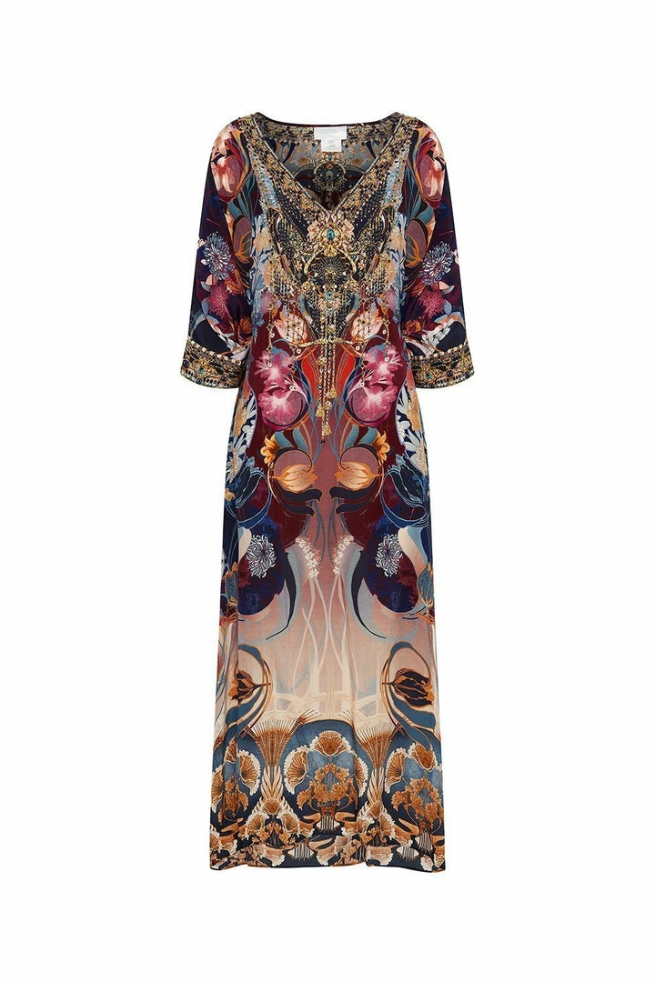 Tantalisingly prints of bold blue and bright purple blooms amongst glistening CAMILLA crystals adorn the new CAMILLA silhouette, the Nouveau Nights Tuck Front Kaftan. Inspired by Art Nouveau and crafted from pure digitally printed CAMILLA silk, this statement dress features a tuck front detail, _ length sleeves and a maxi length. For a daytime ensemble pair with the Solid Black Pom Pom Slipper.