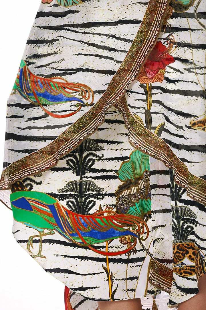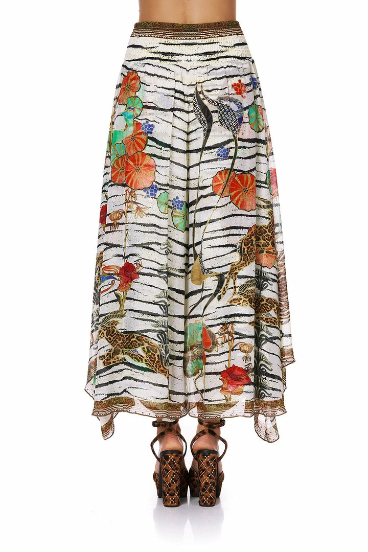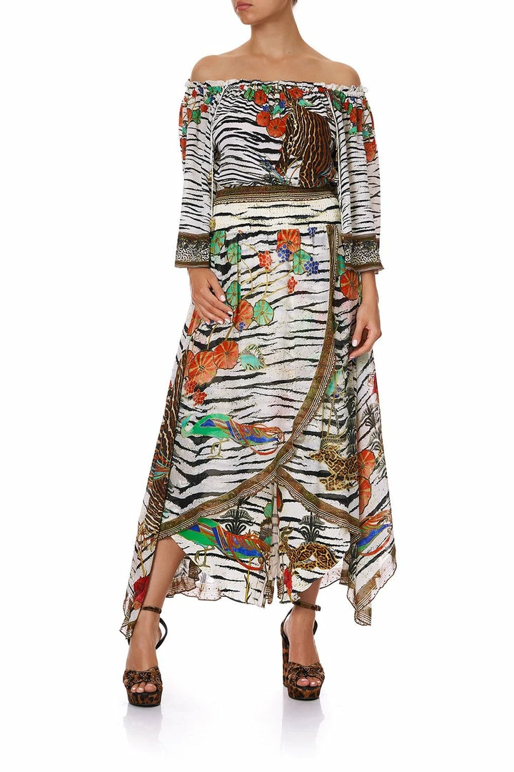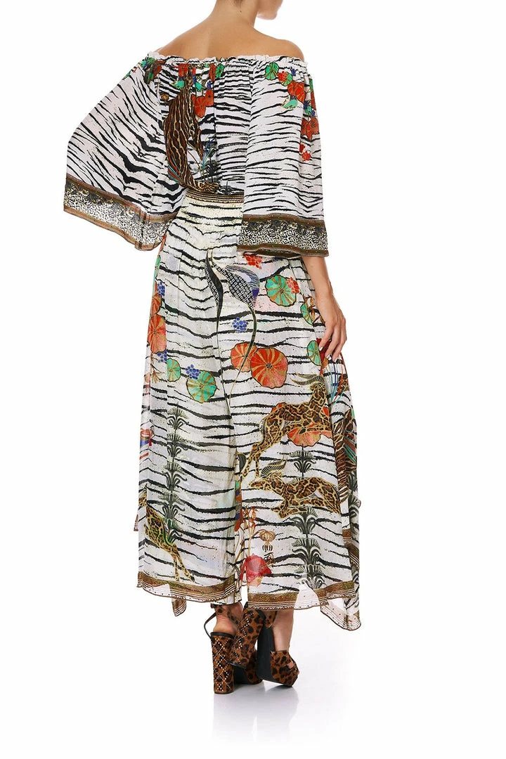 A wanderer’s wardrobe essential, the Cosmic Conflict Cross Overlay Pants are unapologetically boho. Drawing inspiration from a cosmic conflict between Persian folklore against a poetic cream and floral canvas, these silk trousers feature a statement sheer floor-length overlay that billows with movement, a comfortable shirred waistband that can be adjusted to desired hip positioning and is finished with hand applied CAMILLA embellishments. A true vision of boho wear, pair back with matching Cosmic Conflict Off Shoulder Flare Blouse.