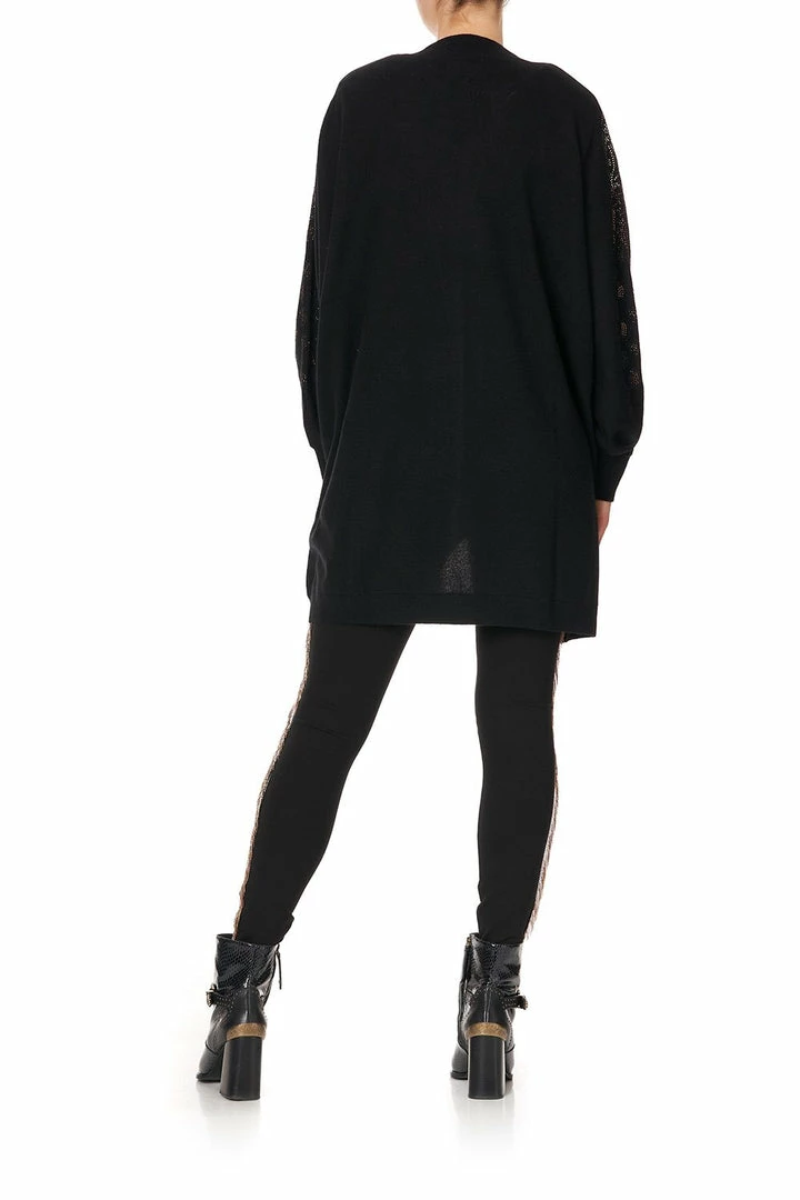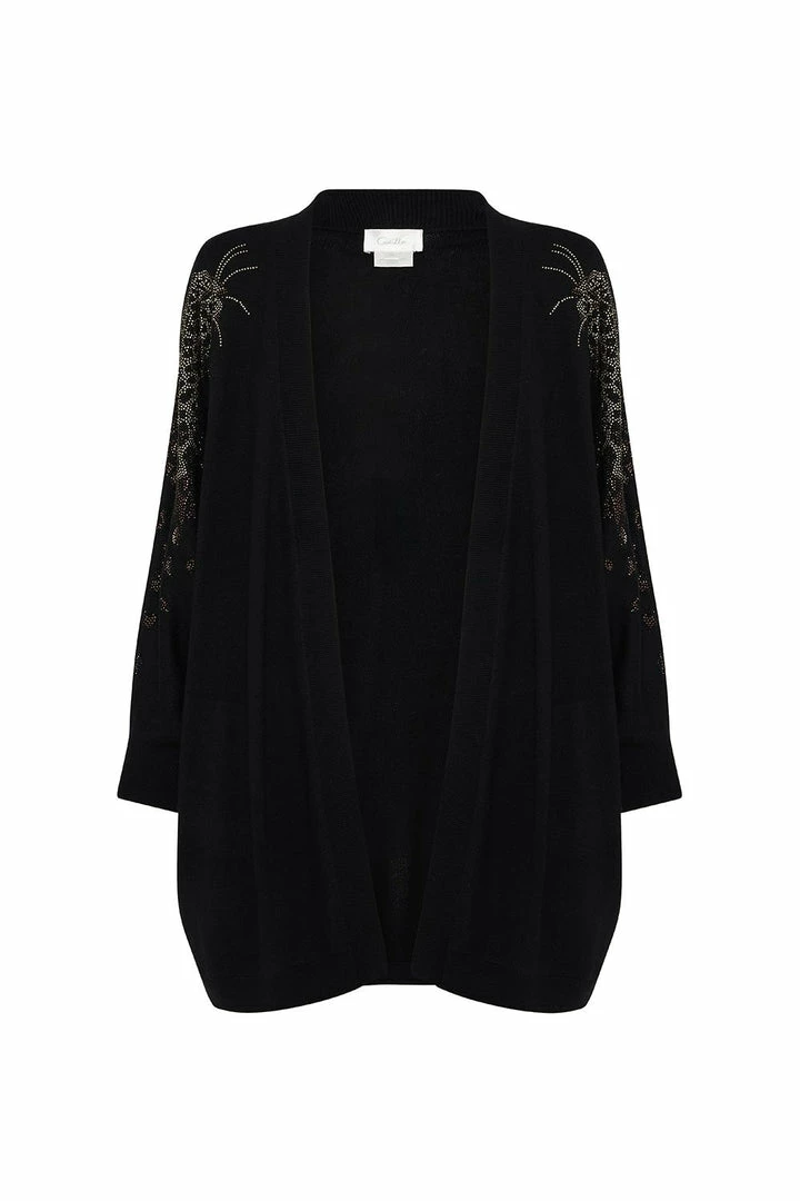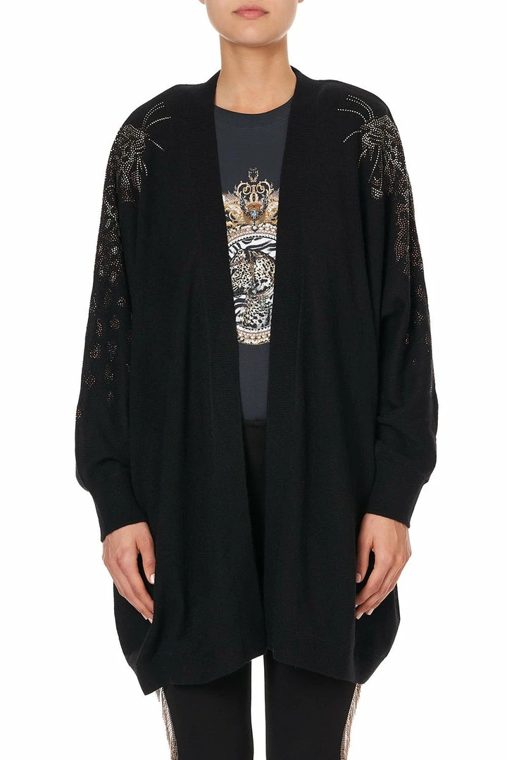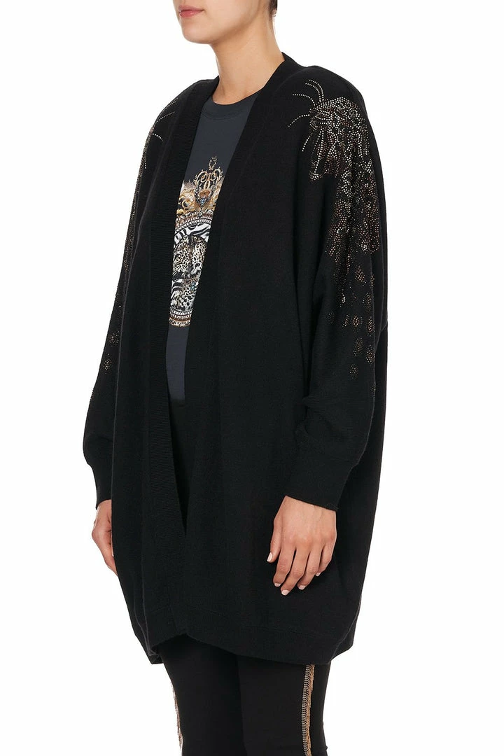 Add a sparkling sense of wonder to any outfit with the Abingdon Palace Dolman Shoulder Pad Cardigan. This easy fit black cardigan is influenced by the extravagant interior design of the 1960s Biba Boutiques, blended with classic CAMILLA signatures. With a relaxed silhouette and crystal detailing emblazoning the Magyar sleeves in a ferocious leopard motif, this winter essential elevates even the simplest of outfits to set the right level of theatre. We love to pair ours with the Abingdon Palace Ponte Pant with Side Seam and a bold lip for a casual yet manicured look for drinks with friends.