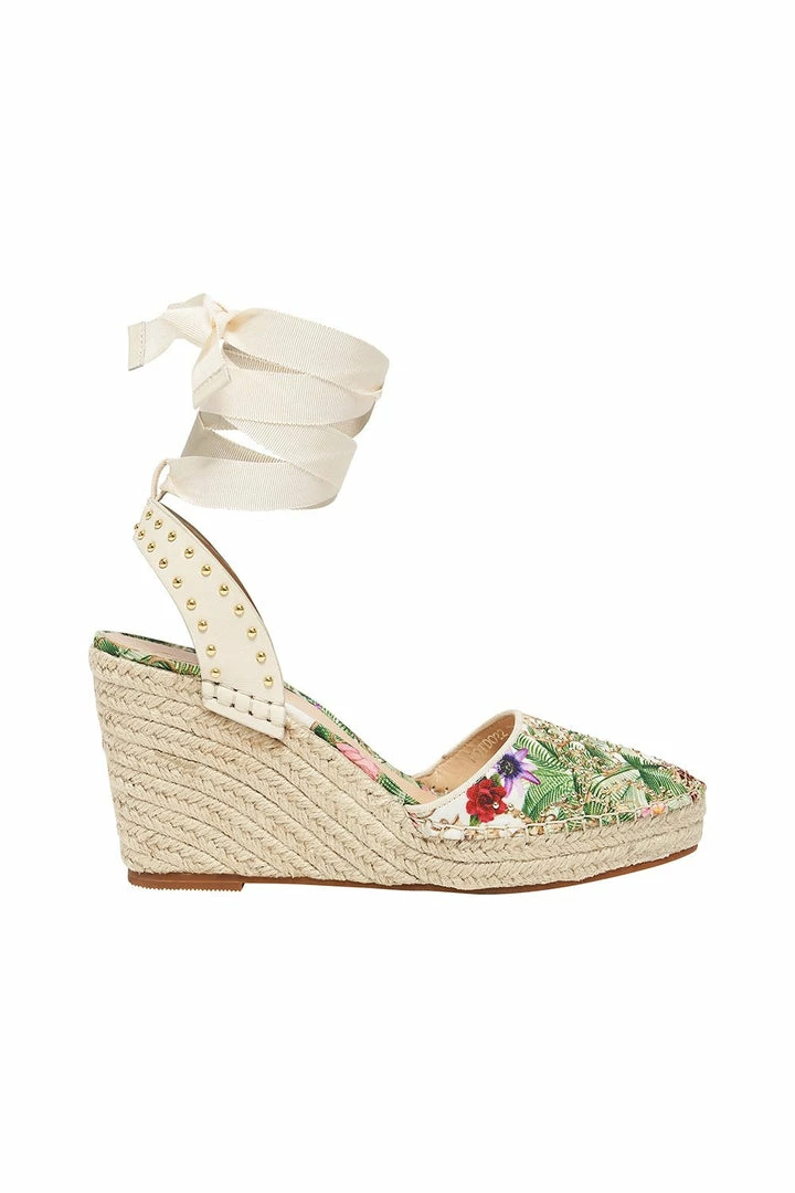 A stolen kiss between two star-crossed lovers inspires the classic romance of the Fair Verona Espadrille Wedge With Grosgrain Tie. Enriched with feminine beauty the floral CAMILLA garden landscape is adorned with pin studs and pairs back with matching Fair Verona collection.