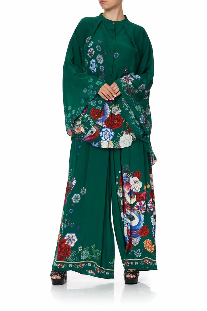 An elevated blouse designed with a rich emerald tapestry that plays backdrop to a scene of hand-painted florals and dragons, the Emerald’s Orbit Kimono Sleeve Blouse is undeniably hypnotic. Crafted with an ethereal printed silk, this floaty top features a button front closure for a chic high neck, a floaty kimono sleeve and a curved hem for an added boho feel. Designed to wear with the Emerald’s Orbit Wide Leg Pant with Gathered Pockets, this piece will elevate every look.