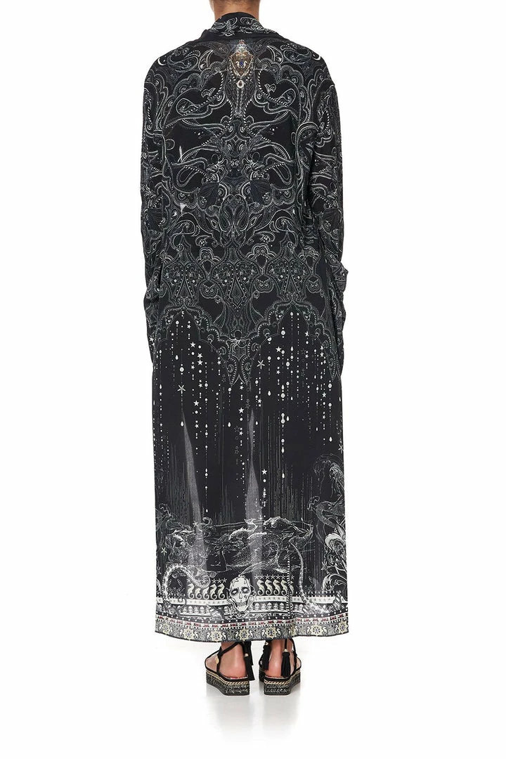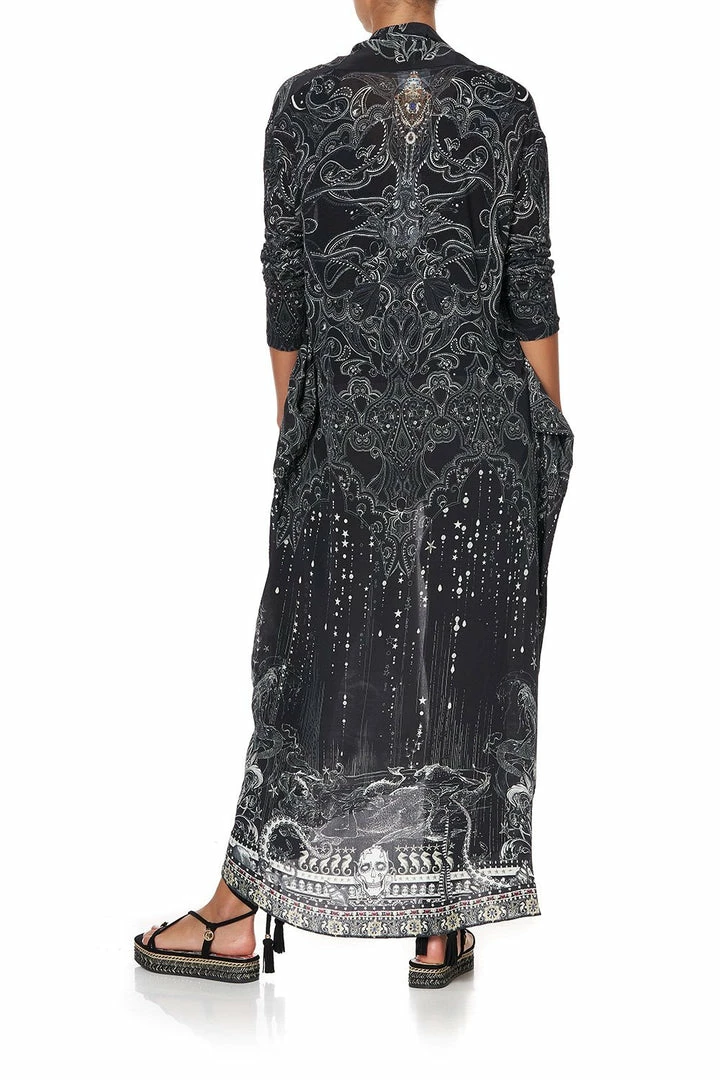 A winter layering piece inspired by the bandana artwork adorning a pirate princess, the Midnight Pearl Long Casual Jacket With Pockets is a pure silk creation opulently furnished with a crystal embellished neckline border. A style for the winter gypsy, this 100% pure silk jacket can be worn with a matching for streamlined luxe or partnered with a companion print for something more contrasting.