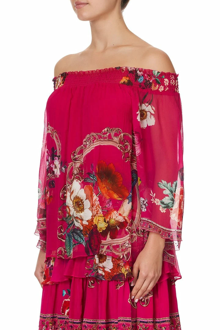 A statement blouse for lovers of romance, the Apple Eyed Off Shoulder Shirred Blouse is divinely boho. Crafted in a billowy printed silk of fairy tale field notes unravelling against a pretty pink canvas, it is designed with a flared retro sleeve, an elegant off shoulder neckline and is finished with hand-applied CAMILLA crystalling. Pair with the matching Apple Eyed Layered Frill Skirt and a chic sandal for an effortlessly striking ensemble.
