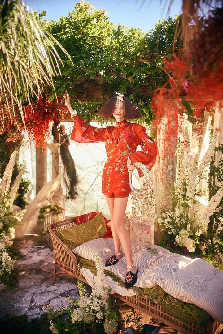 A striking CAMILLA playsuit reimagined with vibrant Chinese red hues, the Forbidden Fruit Panelled Playsuit showcases a hand-painted print that tells a story of winged fanciful marvels floating through nature’s abyss. This striking playsuit is designed with an alluring neckline with button closure, chic shoulder panel yoke, boho flared sleeves, as well as contrast removable belt. The perfect piece for the summer party season; wear with heels for all-night dancing.