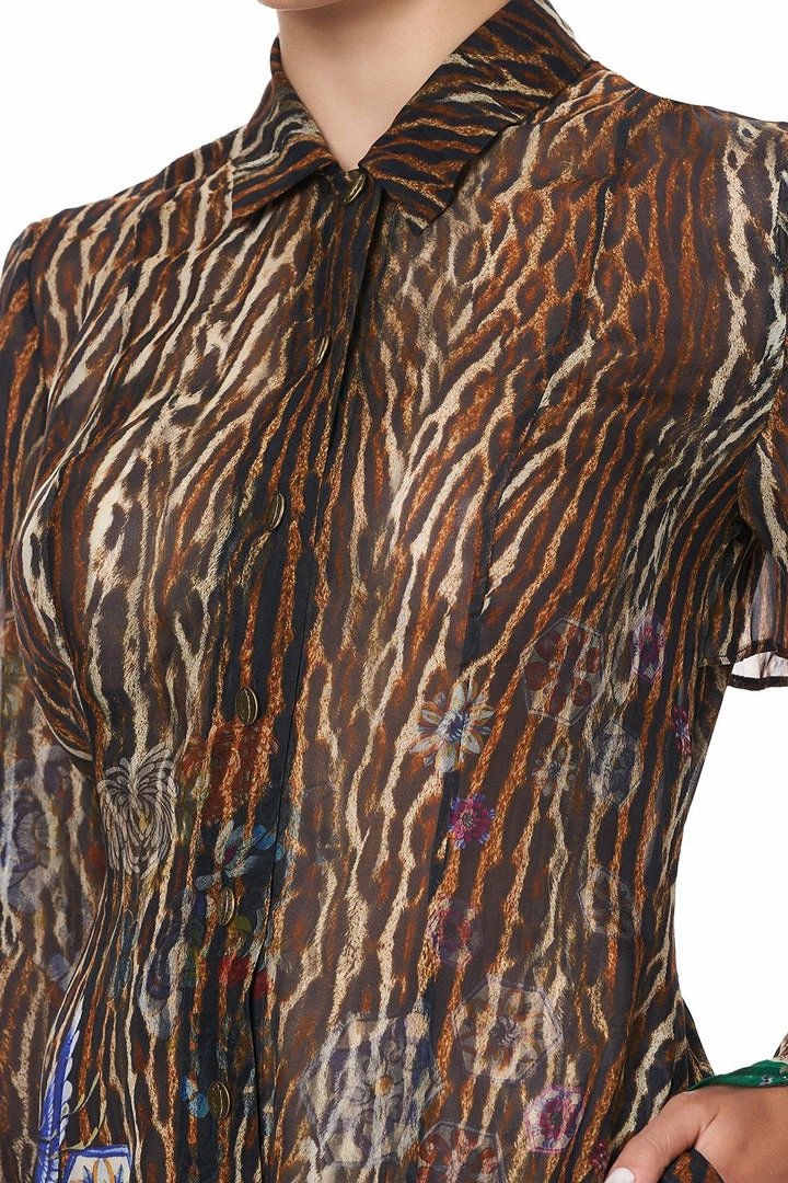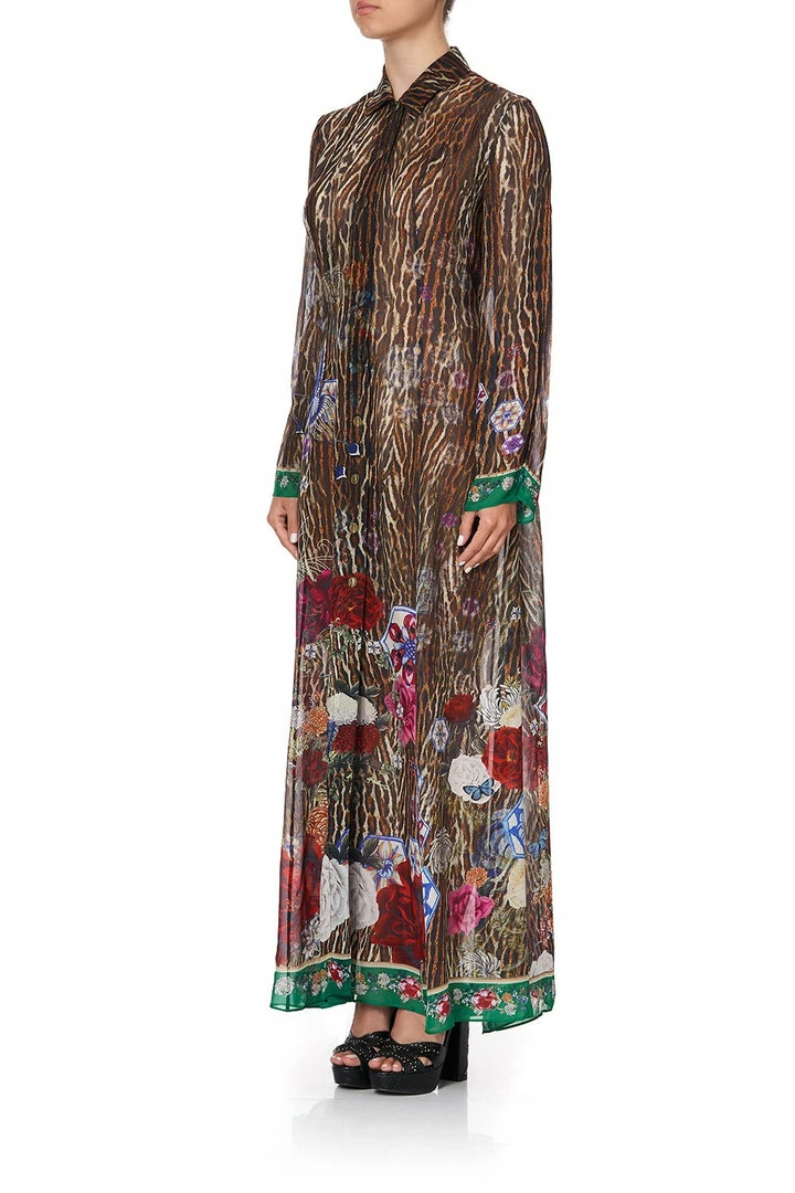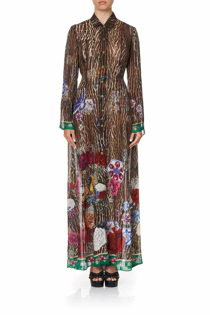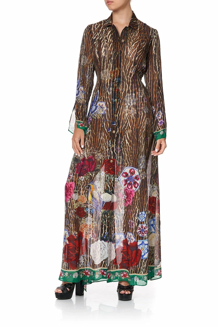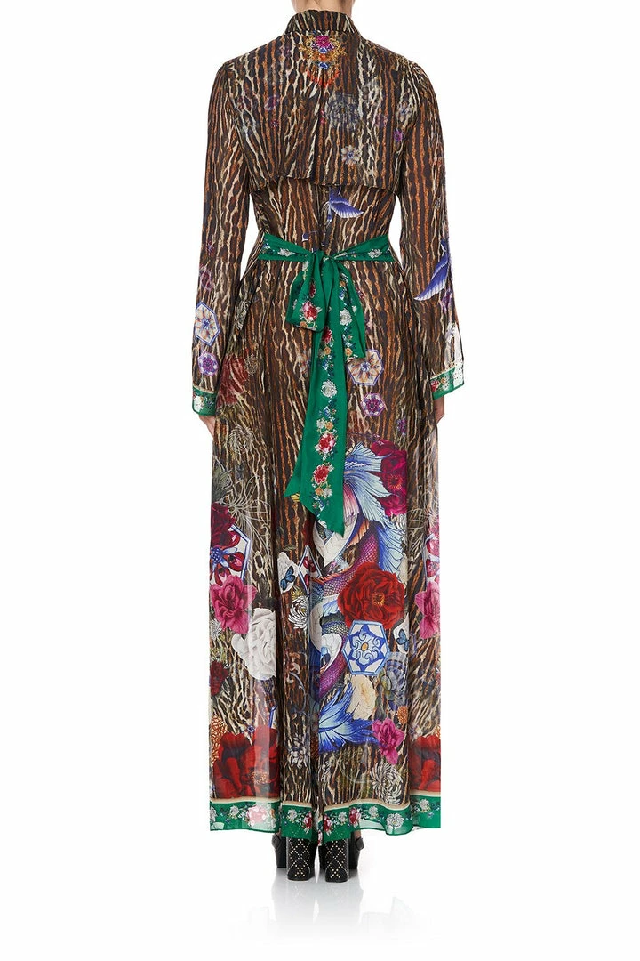 A hero piece in elevated soft suiting, the Jewel of Jupiter Printed Trench is a fierce additional to any wandering heart’s wardrobe. Floor length in design, this soft silk leopard print trench with accents of hand-painted dainty Chinese florals and dragons features a button front closure, chic sleeve split and is finished with hand applied artisan crystal embellishment. Wear over swimwear for resort lounging, or button close and belt to transform into a chic dress.