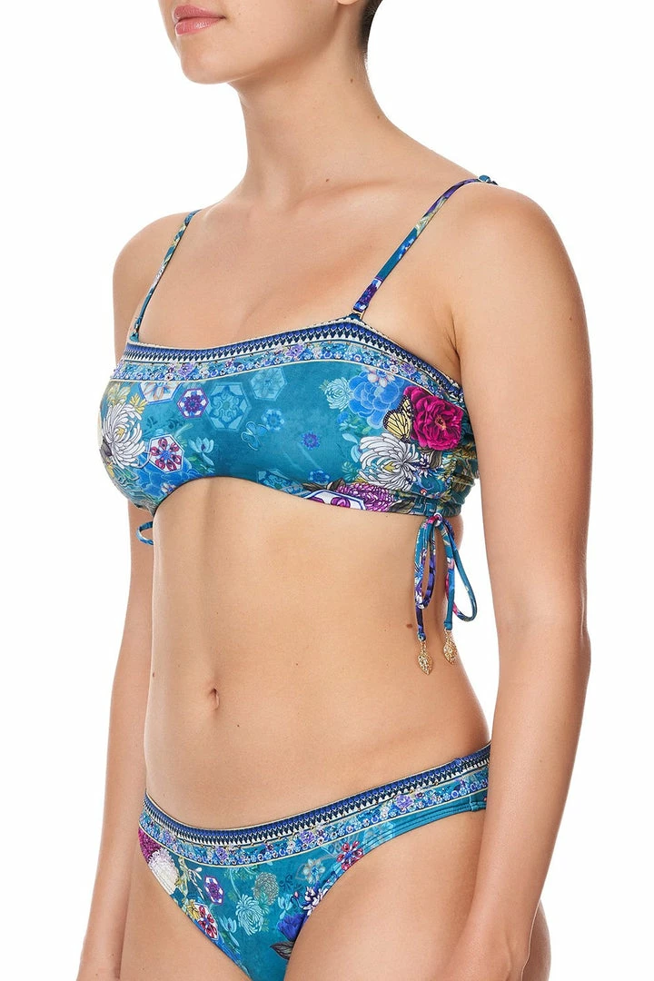 A swimmer top mesmerised by hues of Emerald, the Lunar Gazing Rouched Bandeau is a striking take on classic swimwear piece. Crafted with a soft printed Italian Nylon Elastane that evokes a dreamscape of zodiac tigers and Chinese folk florals, this strapless swimmer top suitable for A-C cups features playful rouched sides with rouleau ties, removable cups, and is finished with hand-applied CAMILLA crystals. All CAMILLA swim pieces are crafted with love to last and retains both colour and shape beautifully. To care for your CAMILLA swim piece, simply cold hand wash and dry flat. Designed to be worn with matching Lunar Gazing Regular Swimmer Tops.