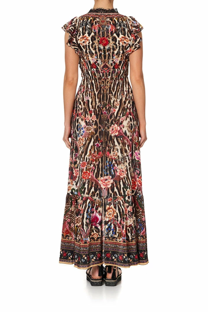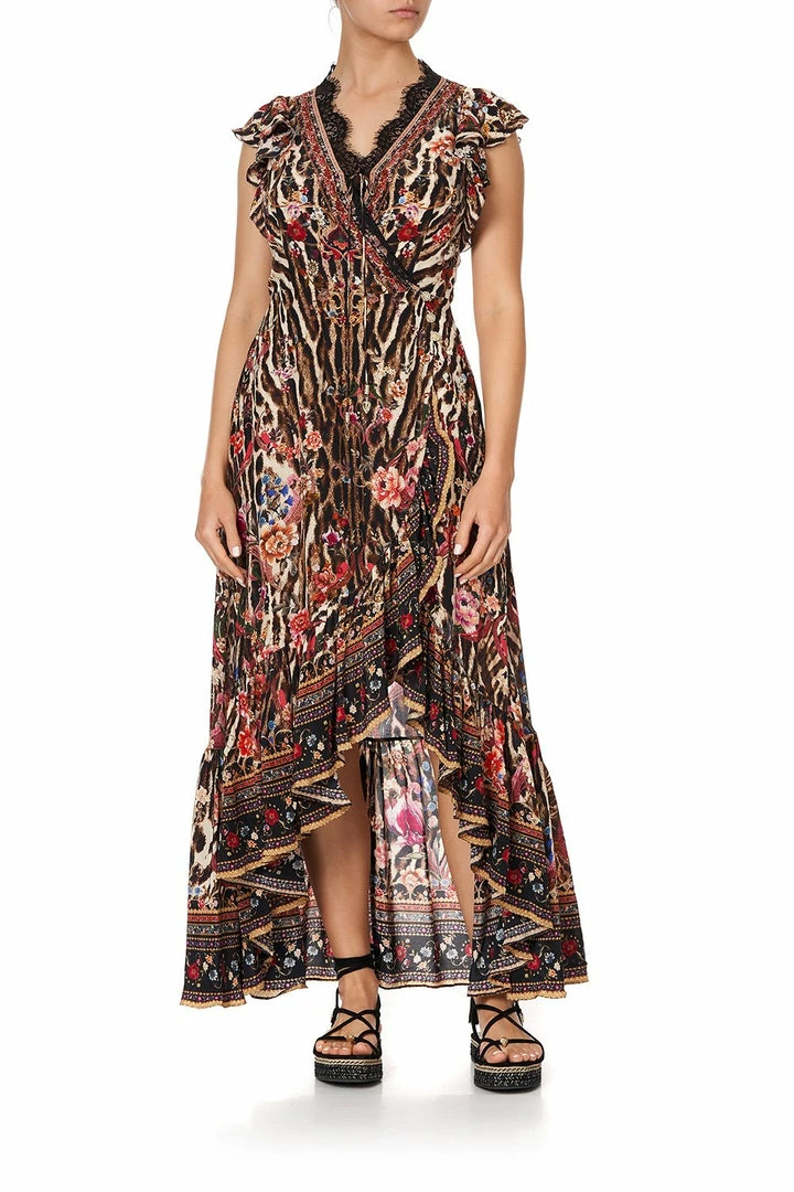 Alluring and lavish, the Liv A Little Ruffle Wrap Dress is a whimsical maxi statement dress for the ages. Lavishly hand cut in a printed silk that emulates a sweet seduction amongst fiercely feminine blooms. Crafted with a leopard silk canvas and adorned in pink florals throughout, this free flowing peasant style dress features an alluring v neckline, floaty high-low ruffle hem, stylish neck tie detail, form fitting waist button closure and is finished with hand-applied CAMILLA crystals. Pair back with heels and styled with sleeked back hair for your next formal event.
