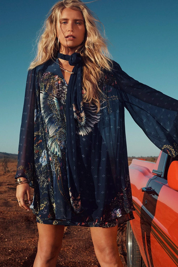 With Australian native wild birds as inspiration – the Southern Twilight Short Dress with Yoke is intrepidly euphoric. With dark navy hues, this printed mini dress features a lightweight removable scarf, flattering flared sleeves, digitally printed silk, as well as neckline crystals as embellishment.
