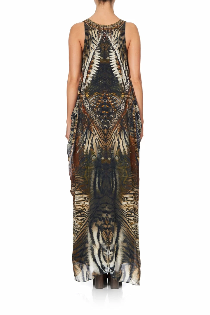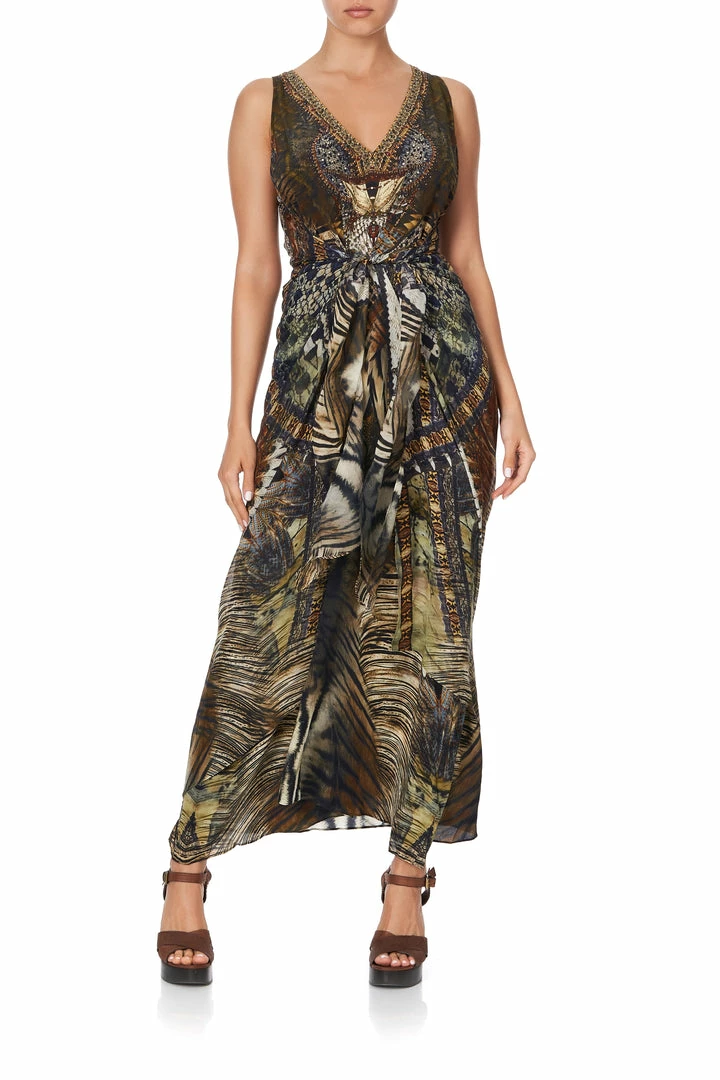Embracing Australiana, the Kakadu Calling Tie Front Multi Wear Dress unveils a scenic hand-painted print. This silk maxi dress features wide straps and silk-chiffon tie-front panels for a multitude of creative styling opportunities, as well as as well as hand-placed crystal along the neckline.